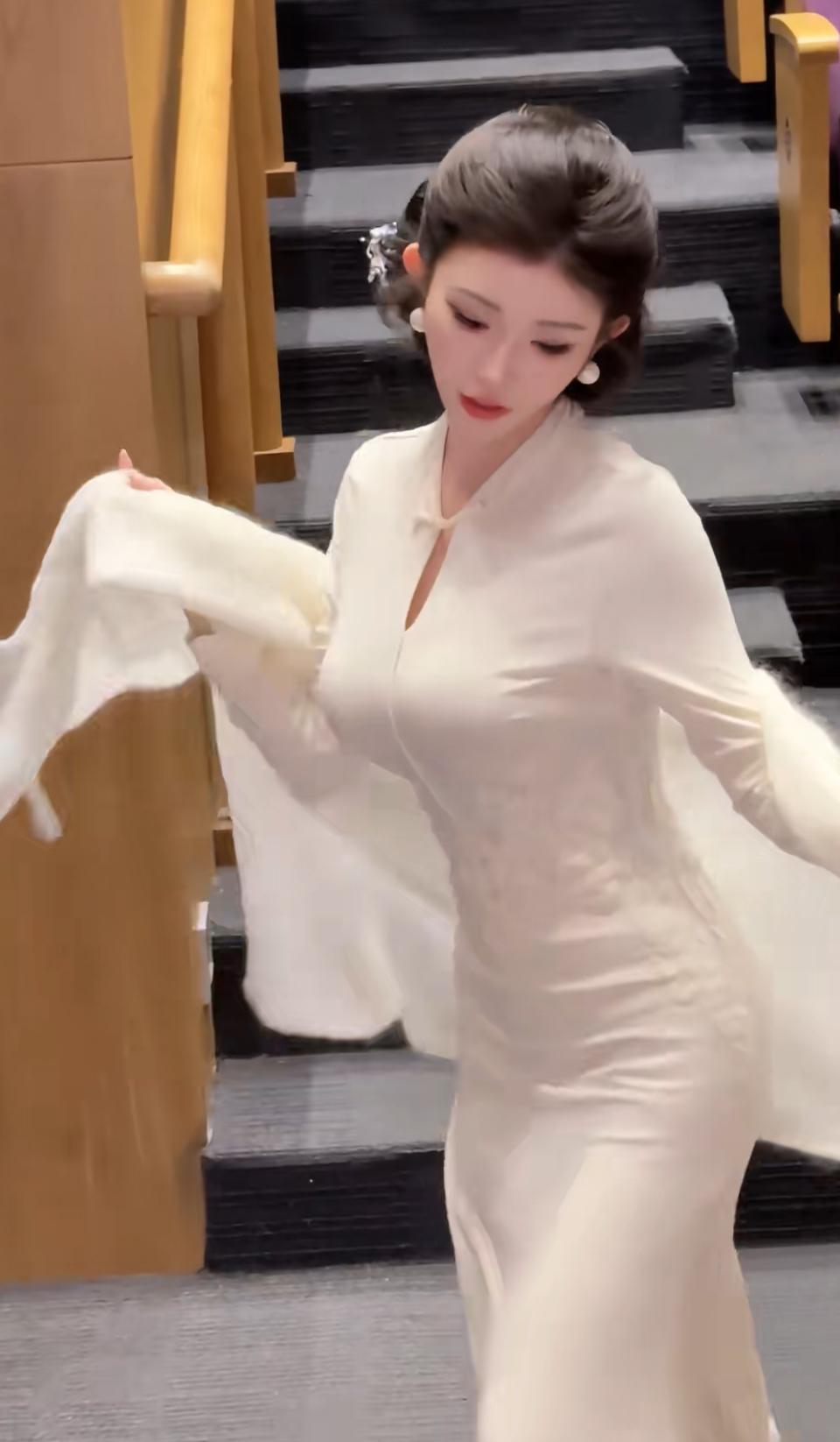白旗袍裹着江南的柔,袖角一扬,连楼梯的光影都跟着软了下来。