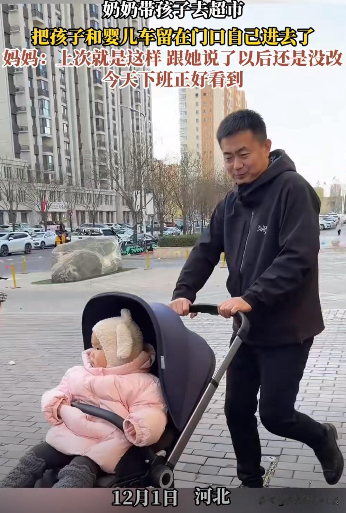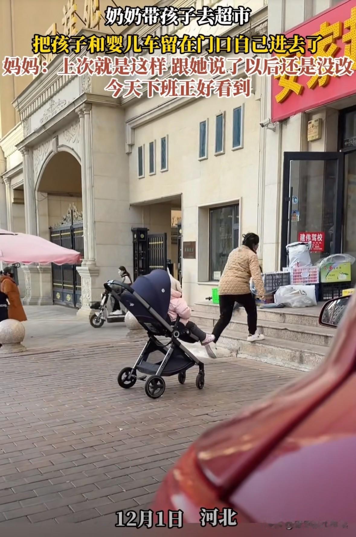 奶奶带孙子去超市,走到超市门口就把婴儿车和孩子一起放在超市门口,自己进去买东西。