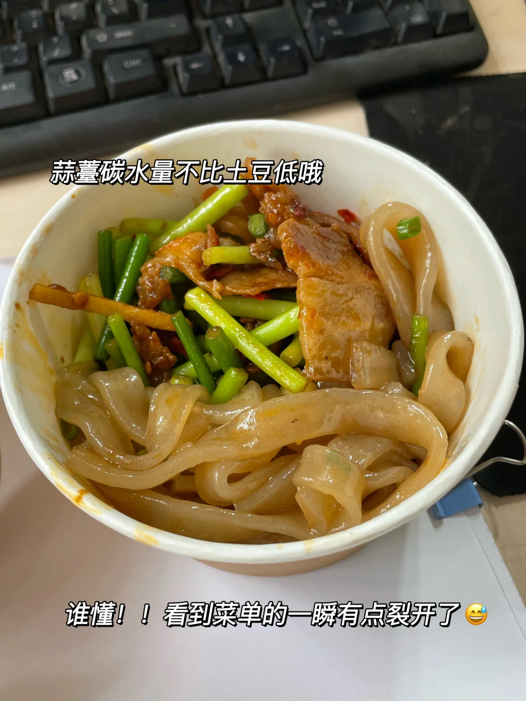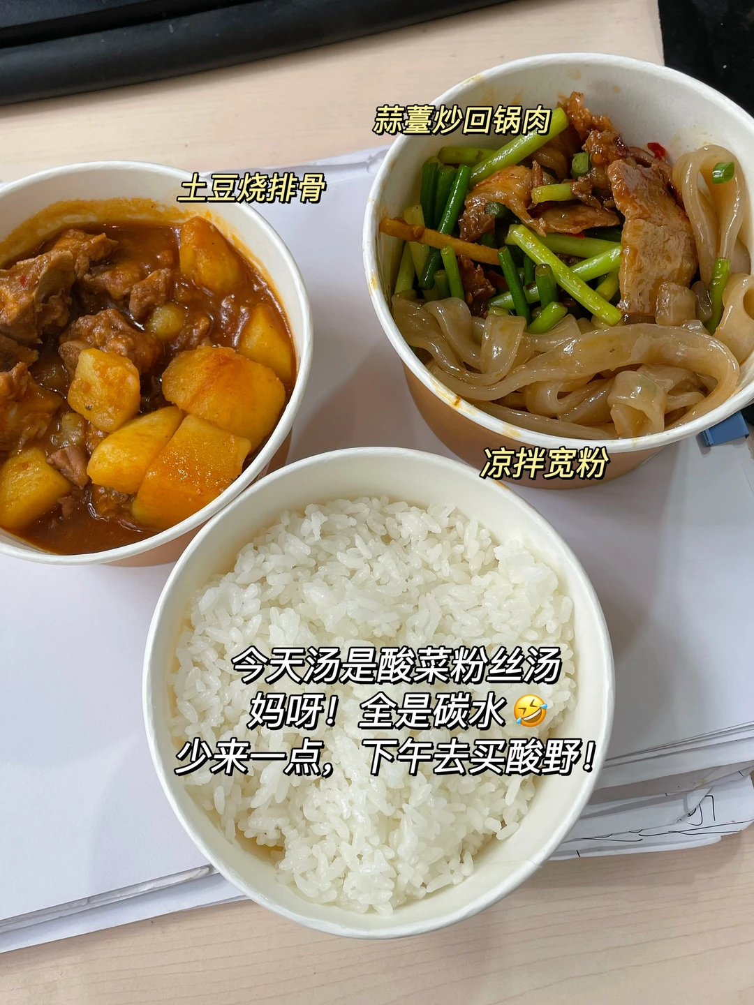 今天食堂:土豆烧排骨+凉拌宽粉+蒜薹回锅肉+酸菜粉丝汤[笑哭R][笑哭R]