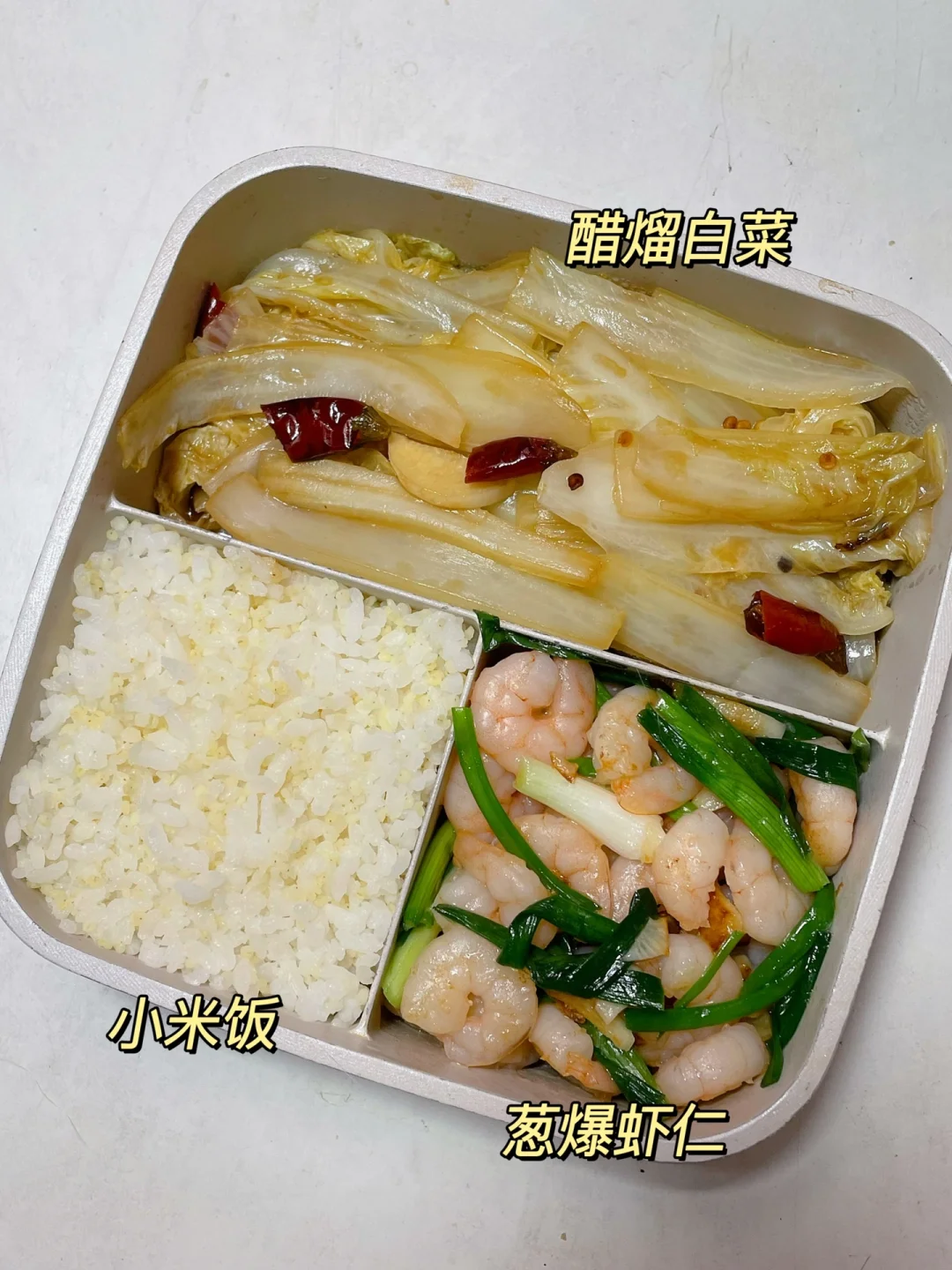 📍 小米饭+葱爆虾仁+醋溜娃娃菜