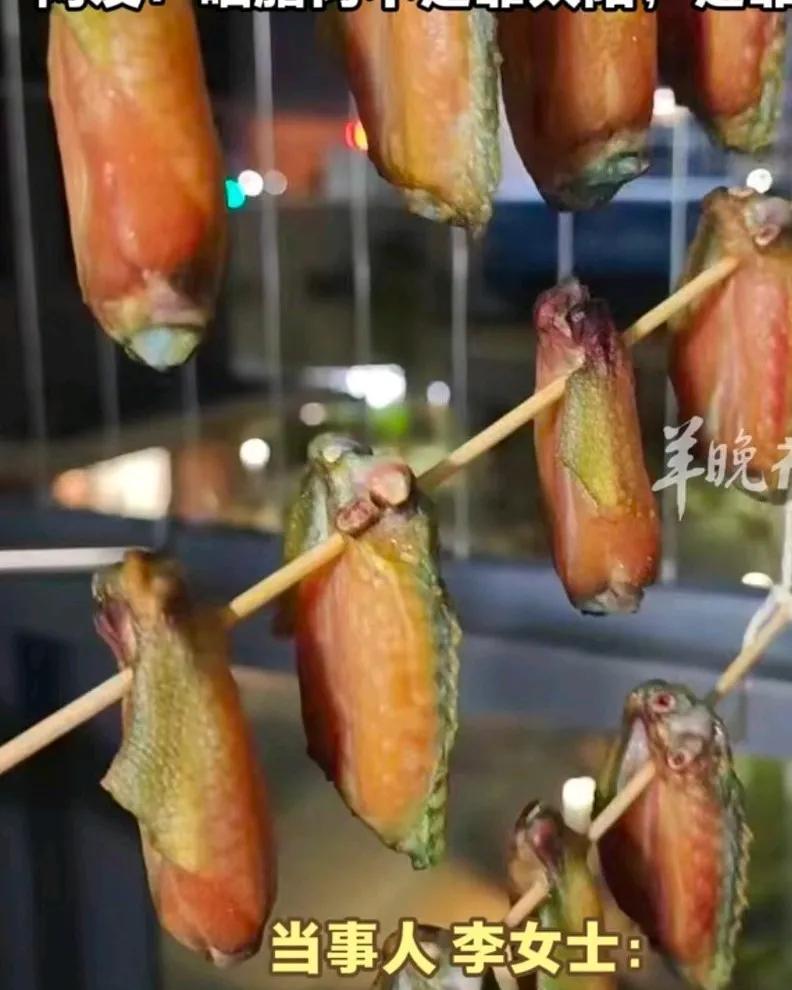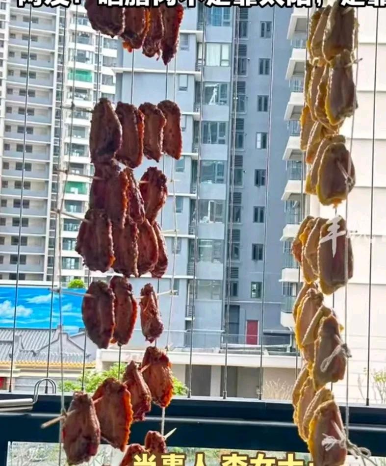 女子大晴天,晒腊肉,叶未收辣鸡翅就变绿鸡翅,女子说买回了一盆鸡翅,然后想学别人腊