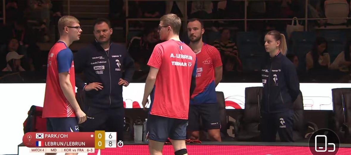 12月3日成都混团第二阶段韩国8:7法国 勒布伦兄弟太可惜了 拼尽全力 第一盘 朴康贤/金娜英2:1小布/帕瓦德 12:14,11:5,11:5 第二盘 李恩惠3:0袁嘉楠 11:4,11:5,12:10 第三盘 张禹珍1:2大布 3:11,10:12,11:9 第四盘 吴俊诚/朴康贤0:3勒布伦兄弟 7:11,8:11,5:11 第五盘 金娜英/崔孝珠2:1袁嘉楠/帕瓦德 8:11,11:3,11:9 法国队太遗憾了, 大布真的是拼了,单打打完, 直接双打! 女队太不争气啦, 就不能给男队加分, 这就是混团, 考量的是队伍的整体实力!