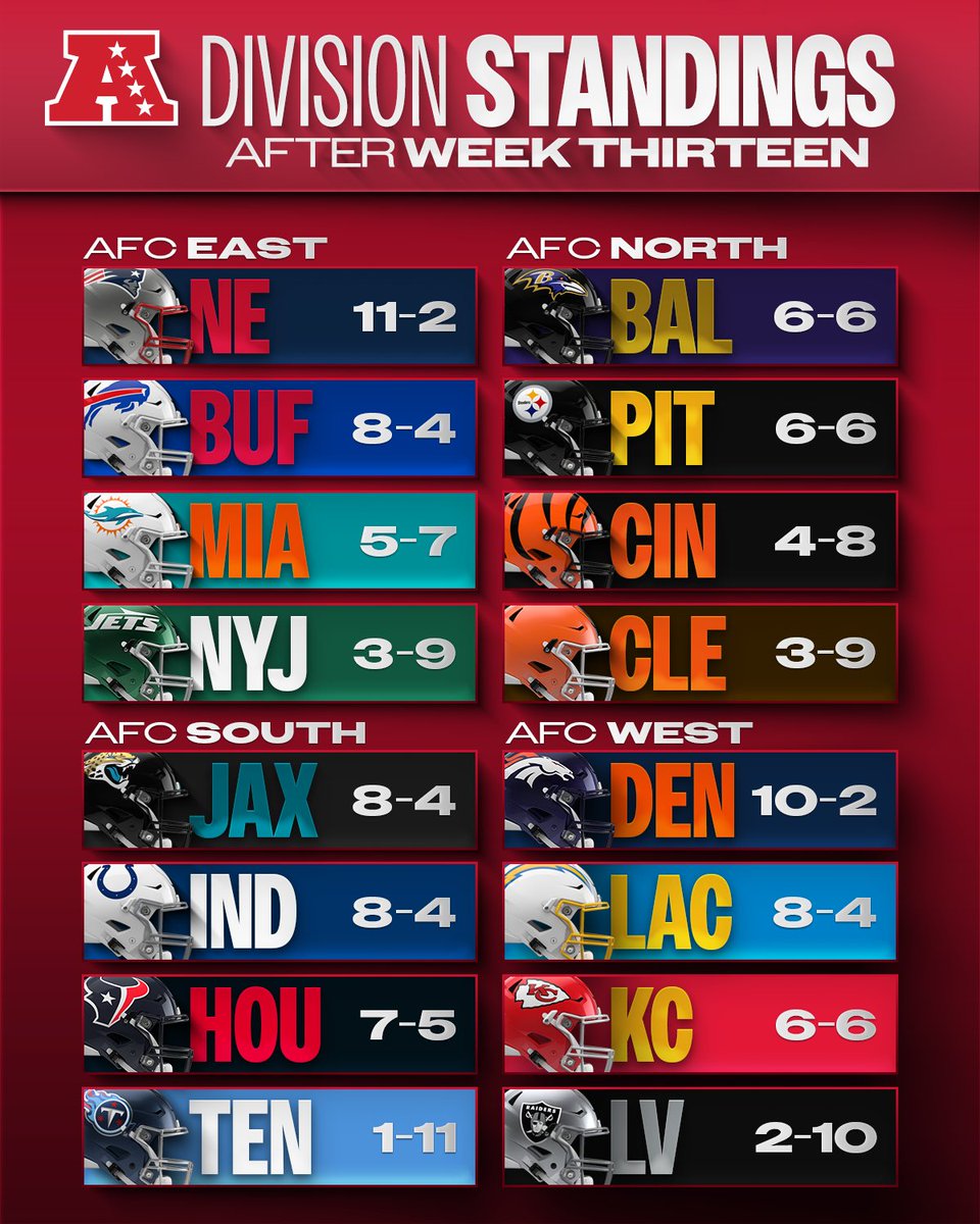 美联东区:新英格兰爱国者,11胜2负领先;北区:巴尔的摩乌鸦,6胜6负;南区:杰克逊维尔美洲虎,8胜4负;西区:丹佛野马队,10胜2负。