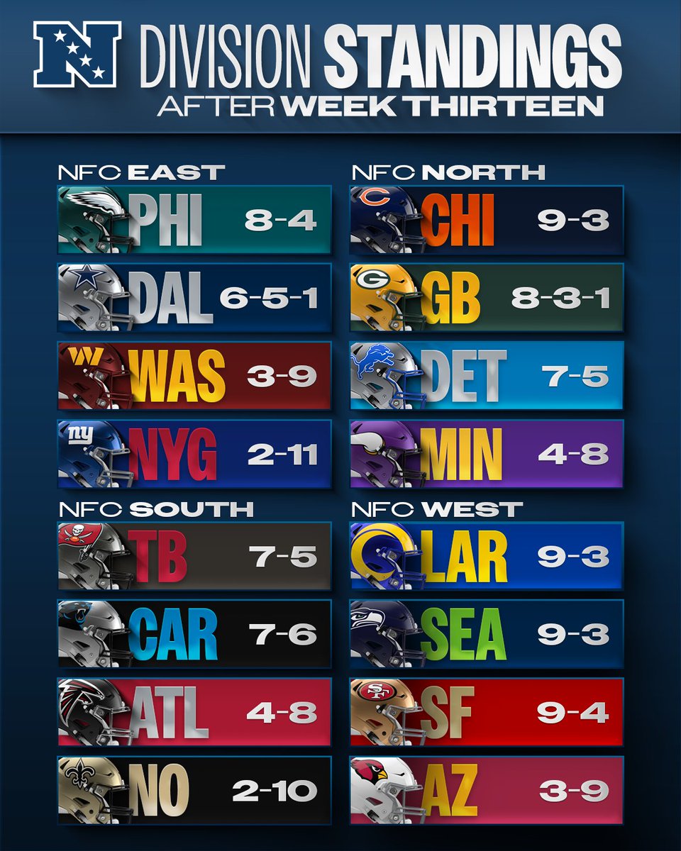 国联东区:费城老鹰,8胜4负;北区:芝加哥熊,9胜3负;南区:坦帕湾海盗,7胜5负;西区:洛杉矶公羊,9胜3负。