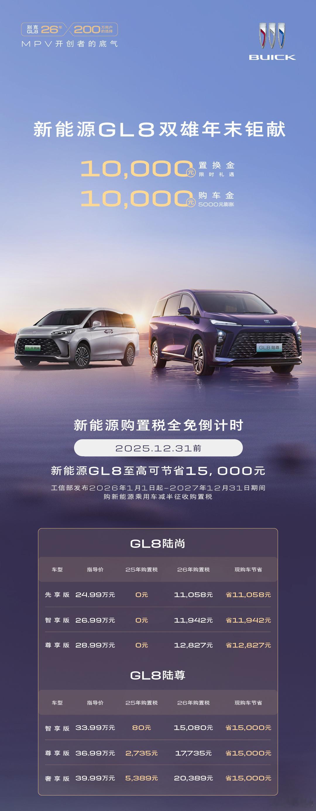 别克GL8陆尚和GL8陆尊也推出了年底的限时购车福利:直到12月31日为止,这两款车的买家都可以享受包括【5000元定金抵10000元的膨胀购车金】和【10000元置换金】在内的多重权益,最高总价值4万元。同时年底前还可继续享受购置税全免,相比明年,最高减免1.5万元购置税。新能源MPV首选GL8GL8销量保值双第一