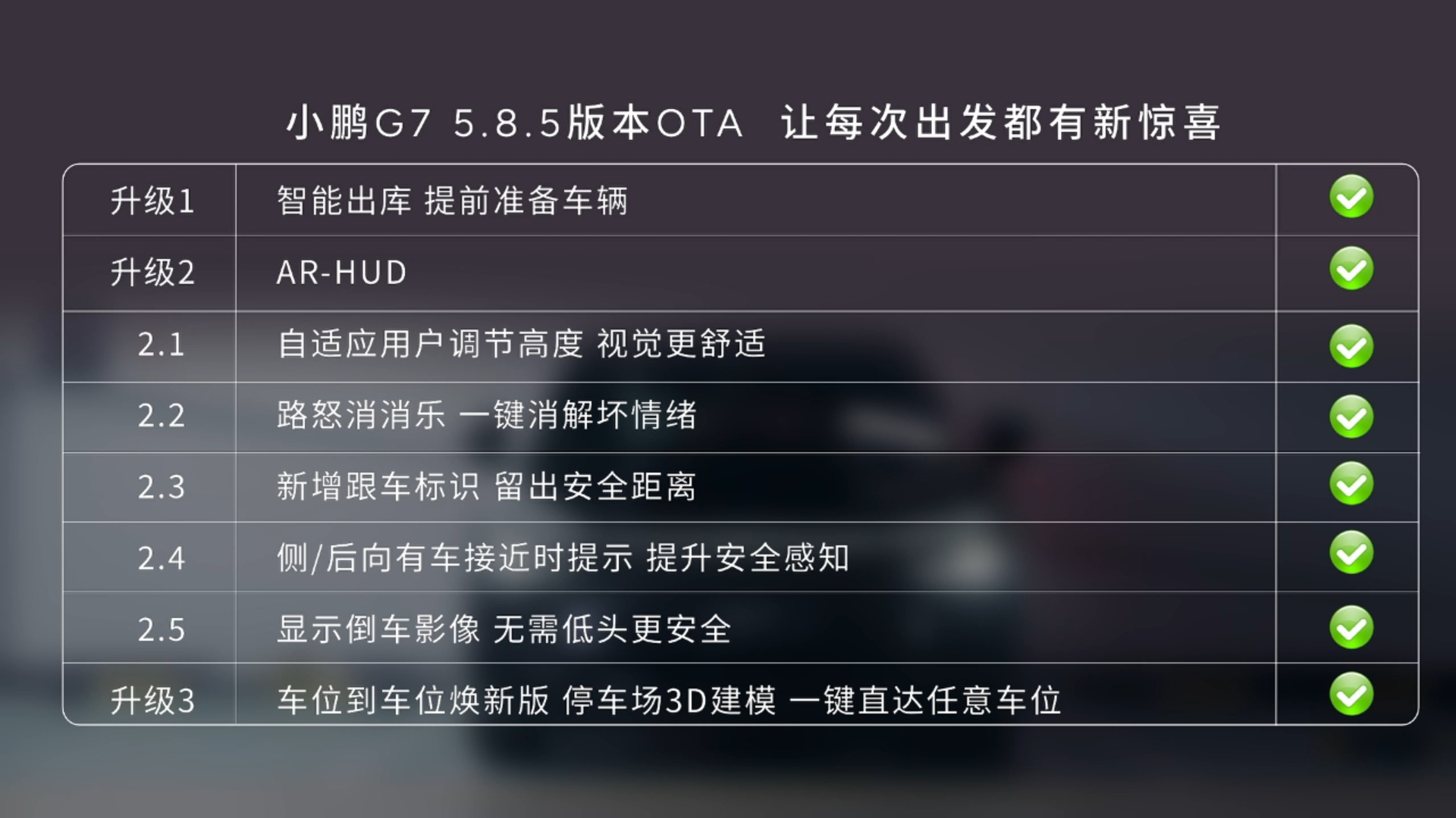 小鹏G7的ARHUD功能再上新 小鹏G7的这次OTA(XOS 5.8.5)很是有料,其不仅在ARHUD部分上新了倒车影像功能,让倒车不低头泊车更安心;同时还针对Max版上新增了ARHUD自适应调节、路怒消消气等4项功能,看来很多功能都陆续等到的。而在AI辅助驾驶上,小鹏G7 MAX版本还新增了车位到车位焕新版,首次入园无需学习即可实现无断点完成车位到车位;并且全系智能出库功能也迎来再度升级,可提前发起减少等待时间。不得不说,小鹏的OTA确实足料~