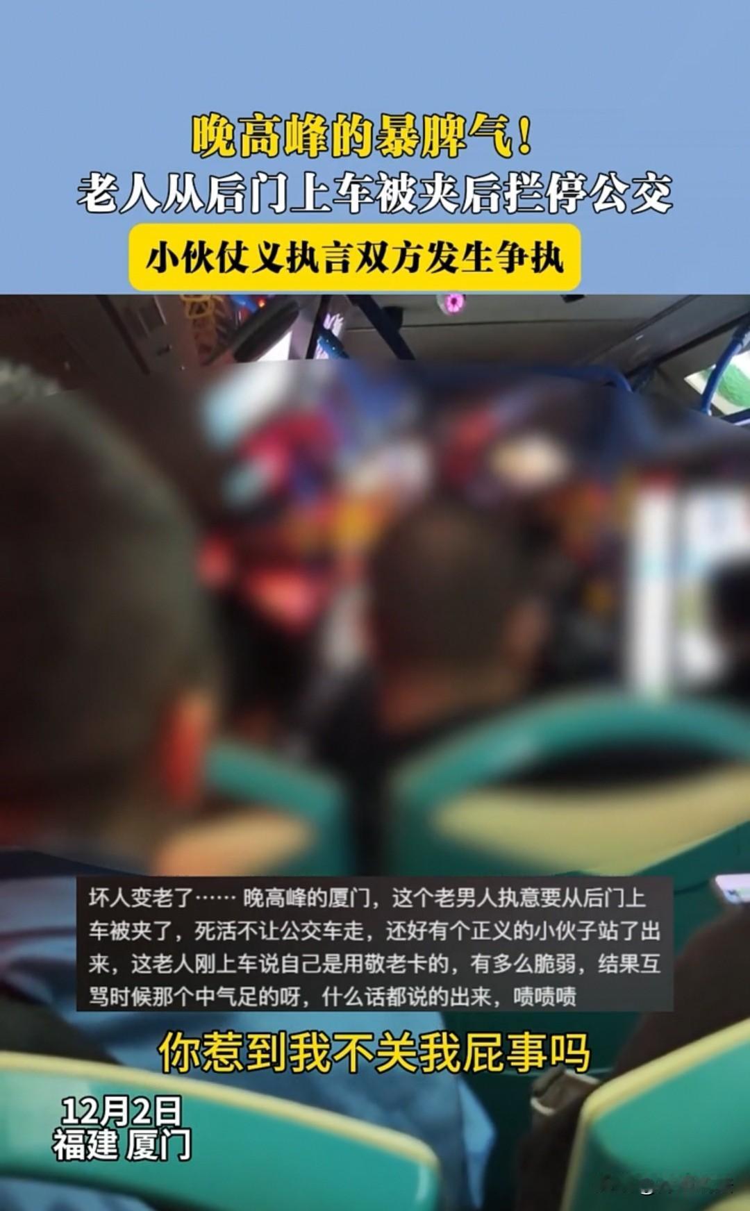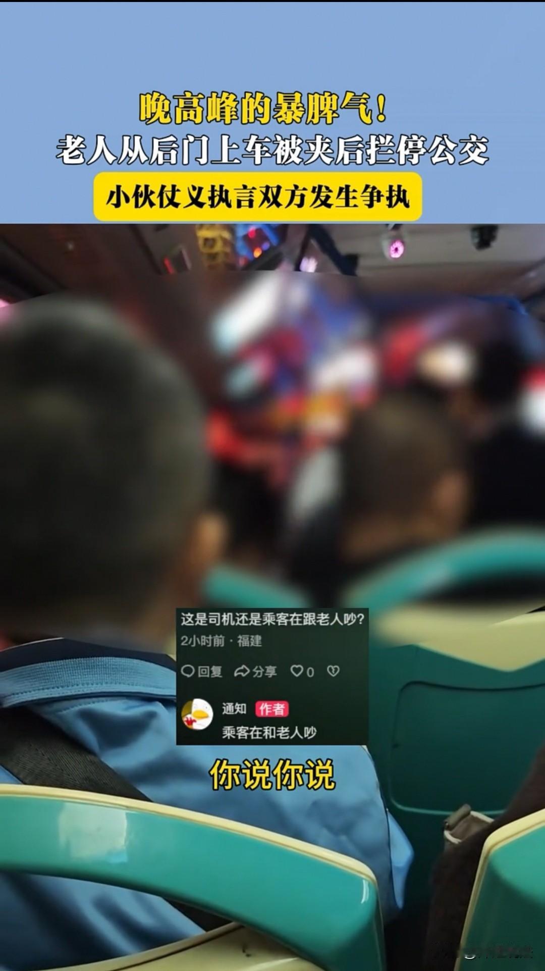 厦门,下班高峰期,一位老大爷违规从公交车后门上车,被门夹,当场拦车不让走。赶时间的小伙子看不下去上前理论,两人瞬间爆发激烈争执。老大爷气急败坏要动手,小伙子毫不畏惧硬刚。 一辆公交车缓缓驶来,停在了公交车站。这一站上车的人比较多,下车的人比较少。 大家依次在前门排好队,井然有序地上车。司机看到最后一个人上车并刷了卡后便开始关门启动车子,想要赶往下一站。 这时后面一个老大爷突然上了车,而此时门已经在缓缓关闭了,不小心就夹到了他的手。 公交车的门力度并不大,老大爷并没有被夹伤,他当即也很快就取出来了,但是他心生蛮横,觉得这是司机失职的问题,造成自己身体难受,必须得让对方长点教训,全然不顾自身违规在先。 于是又赶紧下车拦住了公交车,不让对方走,必须要给个说法。 当然,给个说法是赔礼道歉呢,还是给钱呢?他并没有说明,反正就是拦着公交车,你不能走。 可是他忘记了这个事情,本来就是他有错在先,谁说上公交车要从后门上呀,那都是前上后下。 再加上公交车的门能夹痛吗?无非就是吓了一跳,关键自己被吓,起因也是自己上车不规范的原因。 当然,老大爷可不讲这些,就仗着自己一把年纪了,从后门上又怎么了,再怎么着你也不能关门来夹自己啊,被反驳后更是恼羞成怒,只字不提自己上车有错,一味顶着对方夹到自己这件事纠缠。 车里坐满了想要回家的乘客,他们可不像老大爷一样,从早到晚没事,早上出来买菜,中午出来遛弯,下午出来逛街,有大把的时间呀,一天到晚都是在休息保养玩耍。 和年轻人不一样,他们满心焦急,频频看手机赶时间,脸上满是烦躁与委屈,早上出门是上班,中午乘车回去,还得有很多家务事要做,还要辅导孩子学习,还要孝敬老人,实在耽误不起。 他们坐在车里焦急如焚,只想赶紧赶回家中,要不然到了十一二点钟都没有觉可睡了。 但司机怎么劝老大爷,他都不让的,司机一说话,老大爷就开始回怼他、耍起了赖,反正就是你不给说法,不让你走。 这时小伙子看到后挺身而出,满心气愤又坚定,直接冲到老大爷面前,你到底要干嘛?有没有一点是非心这件事?从头到尾都是你的错,你还在这里振振有词,赶紧让开,我们大家都赶着回家了。 老大爷甩出一个犀利的眼神,大声呵斥小伙子关你屁事,你给我躲远一点。 小伙子可不吃这一套,自己酝酿了那么久,既然要站出来,那必须力挺司机,才能让一车的人能够按时回家,这一步,他绝对不会退缩,准备和老大爷硬刚到底,语气里满是不甘与强硬。 老大爷看到小伙子站在司机那一边,他心里有点发虚,但是他的气势不减,直接想冲过去打小伙子。 小伙子自知自己是正义之举,及时反抗也属于是正当防卫,但是他还是留有余地和老人保持距离,以免不必要的麻烦。 但是嘴上功夫却不弱,压抑着怒火吼道你来呀,你打我呀,你再叫也没用,你看谁在帮你说话,你还好意思在那里拦车不让走。 最后,老大爷一听小伙子敢硬刚自己,又看到车上乘客们不满的目光,再也没有硬气的话说了,他也害怕小伙子反抗,到时候不是对手吃亏的还是自己。 最后大家都力挺司机和小伙子,老大爷才不敢继续造次,网友们看到后也才松了一口。 一、老大爷拦车不让走已涉嫌违法,公安机关可依法予以批评教育或拘留 《治安管理处罚法》第二十三条规定,非法拦截机动车等交通工具,影响其正常行驶的,处警告或者二百元以下罚款;情节较重的,处五日以上十日以下拘留,可以并处五百元以下罚款。 老大爷违规上车被轻夹后拦车,属非法拦截交通工具,扰乱公共秩序,警方可按情节处批评教育、罚款或拘留。 二、老大爷拦车行为若引发事故,可能构成刑事犯罪面临判刑 《刑法》第一百三十三条之二(妨害安全驾驶罪)规定,干扰公共交通工具正常行驶,危及公共安全的,处一年以下有期徒刑、拘役或者管制,并处或者单处罚金。 若拦车致车辆失控、人员伤亡等后果,即构成妨害安全驾驶罪,需依法定罪量刑。 三、老大爷动手殴打小伙子,小伙子符合条件的正当防卫无需承担赔偿责任 《刑法》第二十条规定,为了使本人或者他人的人身权利免受正在进行的不法侵害,而采取的制止不法侵害的行为,对不法侵害人造成损害的,属于正当防卫,不负刑事责任。 老大爷动手时,小伙子为制止侵害采取适度防卫,无需承担刑事责任及赔偿责任。 对于此事,大家如何看待? 素材来源于河南百姓315,2025年12月3日