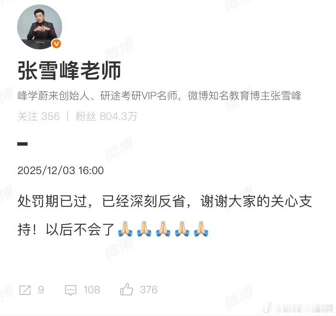 直播中长时间使用污言秽语,账号被限期禁言、停播,张雪峰30天掉粉近13万后,他发文回应已深刻反省,以后不会了! 之前偶尔看过几次张雪峰的切片,只能说专业确实是专业,就是素质说实话有点不敢恭维,跟别人连麦一种趾高气昂的感觉,给人的感官不是很好。 尤其今年先是借十五运蹭热点说谎,明明和女朋友看伍佰演唱会,后又是被揭穿后,没一句解释,道歉更没有,全是污言秽语骂人! 张雪峰说的话,确实给我们普通老百姓打破了很多信息壁垒,其实出发点是想给考生避坑,但有时候话说得太绝对,难免会让部分人觉得被冒犯,甚至误导一些没明确方向的年轻人。 现在能主动站出来反省,承认自己的不足,这份态度还挺难得的,所以说,公众人物影响力大,每句话都可能被放大,谨慎表达、多考虑不同群体的感受真的很重要。