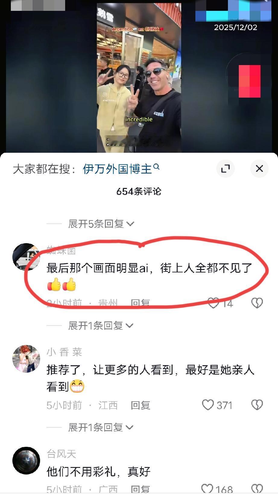 一阿根廷旅游博主在外媒发布视频称:自己独自来到中国一个非旅游热门城市,一位中国女性主动上前与他搭讪、聊天并邀请他外出…… 该男子在视频开头还发布了他们俩人接吻的画面,貌似这位女子非常享受这一过程。女子还自称自己叫“伊万”…… 不过,还是有个别网友质疑这位博主发布的部分画面可能是ai合成的,比如开头两人接吻的画面,街上人一个都不见了。 网友锐评:反正作为我们这样的凡夫俗子,是看不出什么蹊跷的,就是觉得这个女有点太轻浮了,怎么第一次就跟人家接吻呢? 评论区的诸位大神,你们怎么看这个事情?