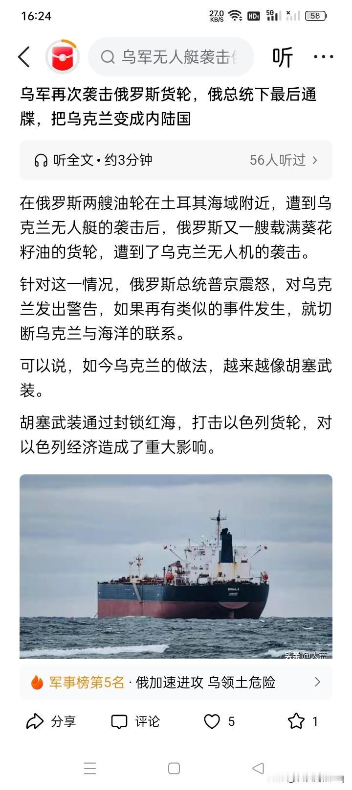 等等看吧! 两艘被无人艇袭击的“影子舰队”的巨型油轮,好像硝烟还没有完全散去,俄罗斯的一艘运输葵花籽油到格鲁吉亚的油轮,又在黑海水域被无人艇袭击。 据传闻说,这彻底的点燃了大帝的怒火,他好像斩钉截铁的说:如果再有类似的事情发生,就将乌克兰与海洋隔离。 乌克兰濒临黑海和亚速海,看上去海岸线还很长,想要将乌克兰与海洋隔开,万万不是一件小事。如果说需要动用惊天动地的武器才有可能办得到,估计也不过分。当然,动用惊天动地的武器,这似乎也并不那么简单,好像也是一件前所未有的、不可思议的事情。 问题是乌克兰会不会被吓住,从此放弃无人艇对海上油轮的袭击,金盆洗手,袭击就此告一段落。如果乌克兰依然如故,继续使用无人艇对油轮进行袭击,大帝是否真将乌克兰与海洋隔离,或者有没有能力将乌克兰与海洋隔离,这恐怕就成了十分关注的事情。 实在说来,各种各样的大话、空话和假话,在这场战争中说的太多了,已经成了家常便饭,见多不怪了。 不过,一切皆不可预测,一切皆有可能,只有拭目以待了。