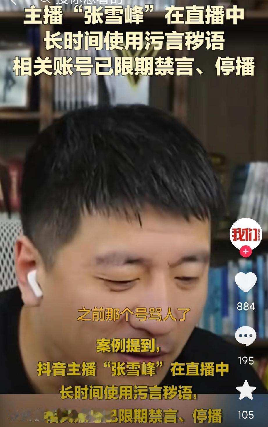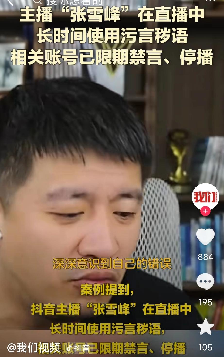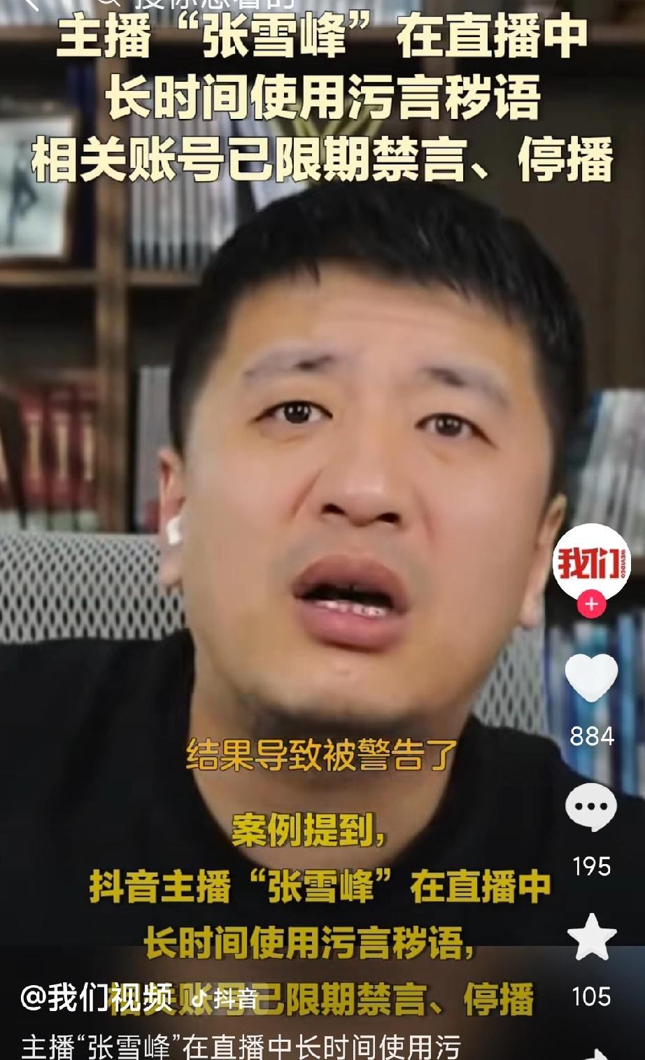 主播张雪峰在直播中长时间使用污言秽语,相关账号已经被禁言停播。