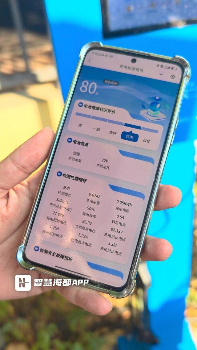 记者现场将一辆电动自行车接入设备,扫码支付后即开始充电。充电结束后,小程序自动生成一份“充电检测报告”,内容涵盖电池健康状况评价、电池基本信息、关键性能指标等。经检测,记者所用车辆的电池状态被评为“优秀”。