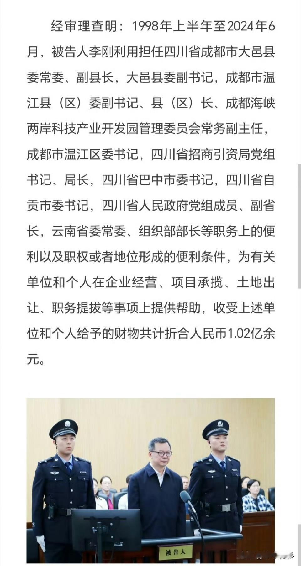 副部级“内鬼”李刚受贿1.02亿,获刑15年:最该防“灯下黑”的人,偏偏成了黑! 消息来源:央视新闻 12月3日央视新闻播报,副部级“老虎”李刚受贿1.02亿获刑15年的消息直接冲上热搜!可能有人觉得又是一起高官贪腐案,但这次的关键,是李刚的身份太特殊——他曾是中央纪委国家监委驻中央组织部纪检监察组组长,本该是监督别人的“执纪者”,结果自己成了最该被查的“内鬼”。 更让人咋舌的是,他的贪腐时间线拉得太长了:从1998年到2024年,整整26年!从成都的县委常委一路做到副部级纪检组长,手里的权力从管地方发展变成管干部监督,可贪欲却跟着职务一路膨胀。别人求他办事,小到企业经营、项目承揽,大到职务提拔,只要给钱就敢开口,1.02亿的赃款,全是国家和人民的利益换来的。 有人可能会问,他明明是监督别人的,怎么敢这么明目张胆?答案很简单:权力一旦没了自我约束,监督者就可能变成最大的风险点。李刚一边拿着纪检监察的“尚方宝剑”,一边干着权钱交易的勾当,这种“监守自盗”比普通腐败危害更大——它会破坏群众对反腐的信任,让监督体系出现“漏洞”。 不过判决里也藏着关键信号:虽然他受贿数额特别巨大,但因为有重大立功表现、主动退赃等情节,依法得到了减轻处罚。这不是纵容,而是法律的公正——不管是谁,只要认罪悔罪、主动弥补损失,法律就会给出相应的从宽空间,但这绝不等于可以法外开恩。 李刚案最该警醒的是:反腐没有“保险箱”,监督者更没有“豁免权”。越是位高权重、手握监督权力的人,越要守住底线。这次15年刑期加600万罚金的判决,再一次证明了“反腐无禁区”不是空话——不管你是监督别人的,还是被别人监督的,只要敢碰红线,就一定会被严惩。 说到底,打铁必须自身硬。只有把监督者的权力也关进制度的笼子,让“内鬼”无缝可钻,才能真正守护住公平正义!