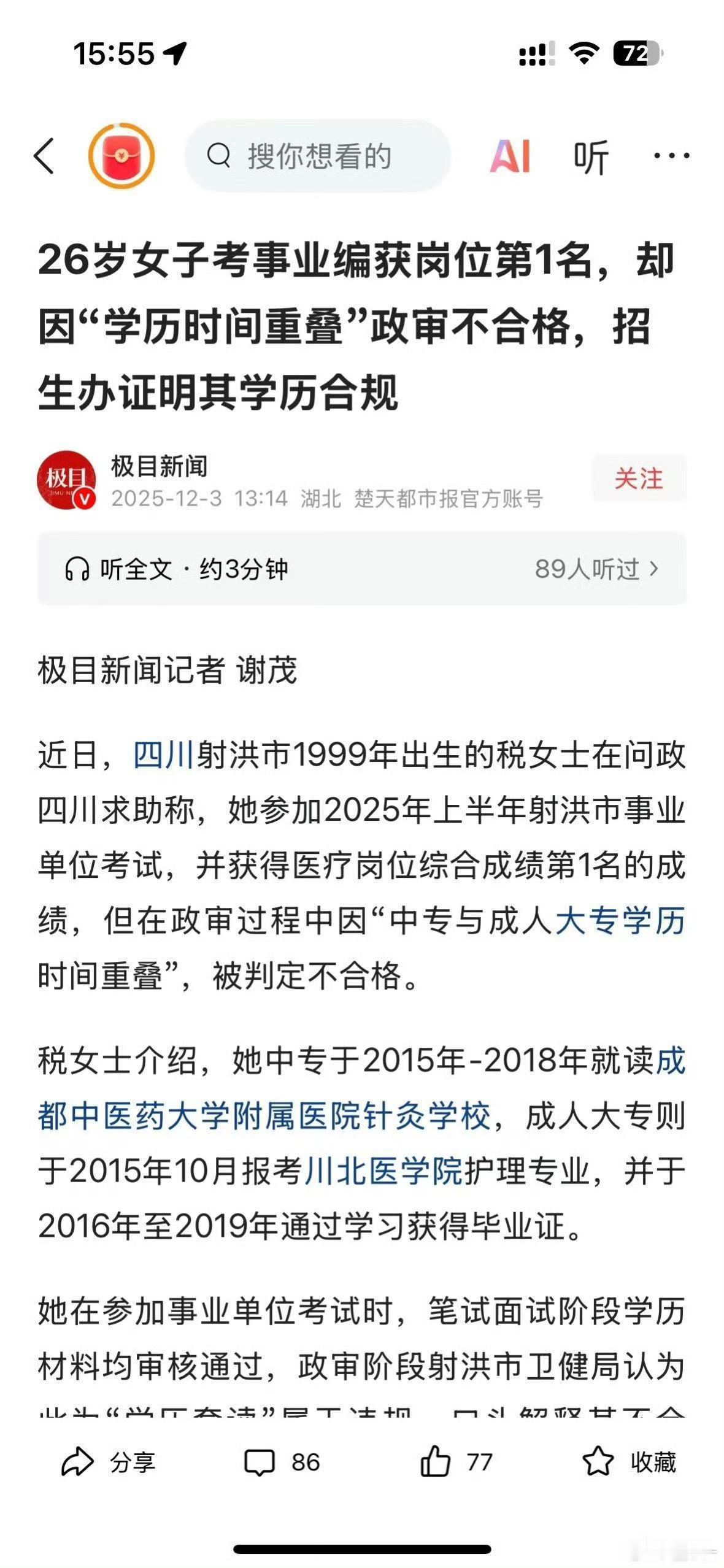 被坑惨了,26岁女子考事业编获岗位第1名,却因“学历重叠”政审不合格。 税女士2015年8月入读中专,同年10月报考成人大专,2018年中专毕业,2019年获大专文凭。 2025年她以射洪市医疗岗综合第一入围,政审阶段被卫健局以“学历套读违规”否决。 税女士在报名、笔试、面试环节的学历材料均通过审核,直至政审才被口头告知不合格,且未获书面说明。 税女士这种情况是中专还没毕业,大专已显示就读,一个人不可能同时上两个学,所以是不合规的,正常情况下只有大专及以上才可以同时读,初中、中专、高中的学历报考成人高考对应不同分数线和录取学校的,她这种情况可能报名文件造假了! 报名第一件事就是筛查简历是否符合报名要求,这种情况就应该应该在报名审核的时候就卡掉,当时通过了,人家辛辛苦苦考第一名再告诉她不合规对她也不公平。 既然犯罪记录都可以封存给机会考公,把有问题的学历档案封存给她一个机会呗。虽然不合规,但人家是实实在在考编成绩第一名。