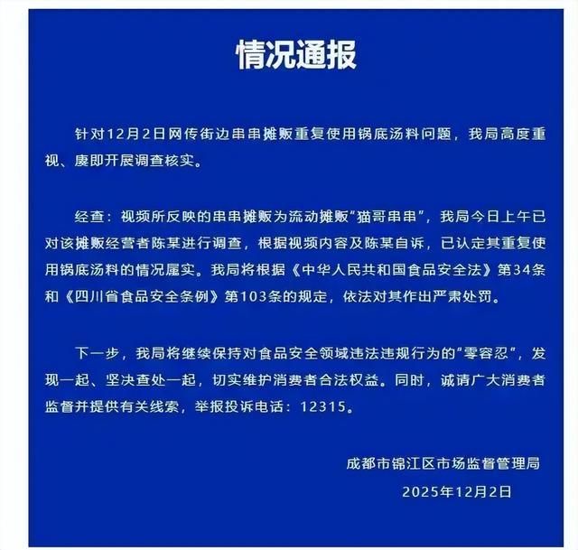 12月2日,成都市锦江区市场监督管理局就此发布情况通报。通报称,针对网传“街边串串摊贩重复使用锅底汤料”问题,该局高度重视,立即组织核查。经查,视频所反映的摊贩确为流动摊贩“猫哥串串”,经营者为陈某。该局已于12月2日上午对陈某展开调查,根据视频内容及陈某自述,确认其重复使用锅底汤料的情况属实。