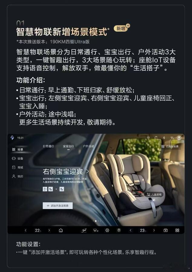 方程豹钛7 的首次OTA开启推送,新增智慧物联场景模式(一共三种)和蚂蚁森林功能,并且对多项功能做了优化。这里我觉得最有意思的是场景模式跟车上硬件的互联,比如“宝宝出行”模式就提供了儿童座椅的迎宾和回正功能,使用起来更加方便;而且,从更新信息来看后续还会有新的场景模式加入,也值得好好期待一波 新能源汽车汽车资讯