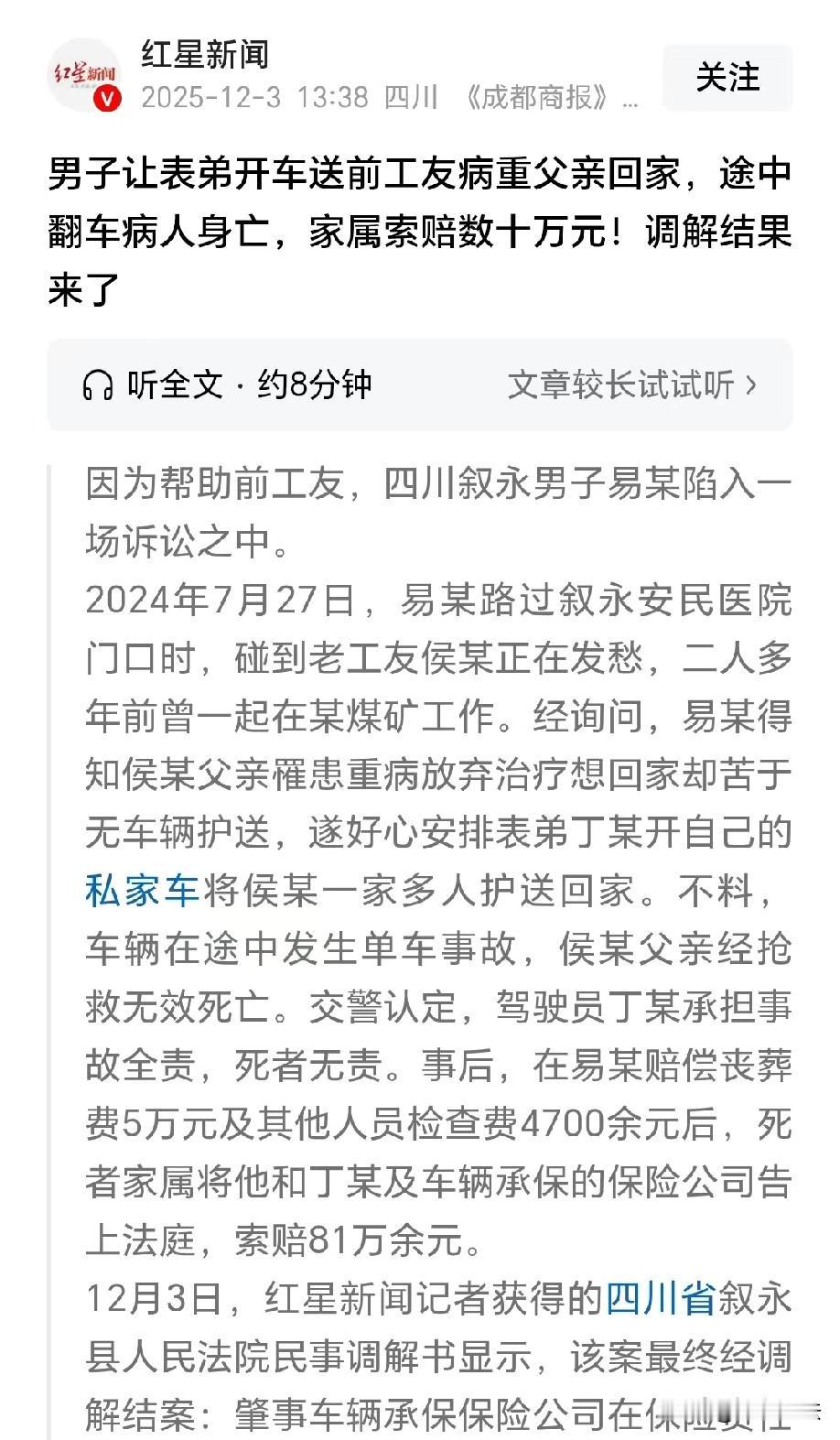 四川泸州,男子在医院门口遇到曾在煤矿一起奋斗过的工友,工友父亲身患重病,家人决定放弃治疗,想把老人送回家却迟迟打不到车。男子刚好家中有事,只能叫来表弟开车把工友一家送回家。原本是好心帮忙,不成想,表弟驾驶途中发生事故,导致老人死亡,交警认定驾驶员负事故全部责任。事后,男子主动赔偿老人丧葬费和其他人员检查费5万多元,工友还不满意,又把男子和他表弟告上法庭,索要81万的巨额赔偿,法院这样处理。 2024年7月27日上午,侯某坐在某医院门口,急得像热锅上的蚂蚁,手里紧紧攥着父亲的出院手续,一脸茫然和无奈。 父亲侯某明身患重病,住院8天病情反复加重,心肺功能差还伴有多种基础病,医生建议转重症监护或上级医院治疗。 考虑到治愈的可能性较低,一家人也实在扛不住这高昂的治疗费用,侯某只能忍痛决定放弃治疗,想尽快把老人送回农村老家。 可眼看都快中午了,找车的事却屡屡碰壁,没有一辆车愿意送他们回去,侯某急得直跺脚。 就在这时,侯某看到一个熟悉的身影,他赶紧喊了声“易矿”,果然是多年前在煤矿一起打拼的老工友易某。 两人失散多年没联系,没想到会在这种场合重逢。 易某见侯某愁眉不展,赶忙上前询问,得知老工友的难处后,心里也跟着着急。 说来也巧,易某刚好在医院附近从事救护车运营业务,侯某之前也打过救护车的电话,只是没料到电话那头就是易某。 而且,易某的救护车全部出任务了,也没法承接侯某的业务。 得知是自己的老工友有困难,易某当即拍胸脯保证,一定想办法把侯某一家人送回家。 事不凑巧,这天,易某家里刚好有客人走不开,但又不能不管老工友,易某便立刻联系了表弟丁某,让丁某开他的私家车来帮忙送一下侯某。 因为用的不是救护车,也是出于私人之间的好心帮忙,两人压根没提费用的事。 在侯某看来,这是老工友仗义相助,而易某也只想着帮昔日兄弟解燃眉之急,压根没多想后续。 意外总是这么突然,丁某驾驶着易某的小客车驾驶途中,车辆突发险情,丁某情急之下采取措施不当,车子直接翻了过去。 车厢里一片混乱,侯某明本就虚弱的身体遭此撞击,当场受伤,其他人也不同程度擦伤。 本就重病缠身,再加上意外的车祸,即使众人将侯某明送往县中医医院抢救,可终究还是没能留住老人的生命。 不久后,交警部门出具了道路交通事故认定书,认定驾驶员丁某承担事故全部责任,侯某明无责。 本是好心帮忙,没想到会出这样的事故,易某得知消息后,心里又愧疚又着急。 没等侯某家人开口,他主动垫付了5万元丧葬费,还承担了其他乘客4715.23元的检查费,前后一共花了54715.23元。 易某觉得,自己已经尽了最大努力弥补,车辆损失也自行承担了。 万万没想到,侯某家人并不满意,多次找到易某和丁某,提出巨额赔偿,甚至还将他们和保险公司告上法庭,索赔81万余元。 好心帮忙,怎么反倒成了被告,易某想不通,自己一片好意,没要一分钱报酬,现在却要面临巨额索赔。 而侯某一家则认为,丁某驾驶不当导致车祸,是父亲死亡的诱因,易某作为车主,理应承担责任,保险公司也该在保额范围内赔偿。 《民法典》第一千二百一十七条规定,非营运机动车发生交通事故造成无偿搭乘人损害,属于该机动车一方责任的,应当减轻其赔偿责任,但是机动车使用人有故意或者重大过失的除外。 易某应老工友侯某请求,让表弟丁某开私家车无偿运送侯某一家,未约定任何报酬,完全符合“好意同乘” 。 虽交警认定丁某负事故全部责任,但该责任仅针对交通事故本身的过错划分,并非民事赔偿责任的最终依据。 易某的行为属于好意施惠,无盈利目的且已主动赔付5万余元,结合丁某无故意或极端重大过失的情形,应当减轻施惠方责任。 《民法典》第一千一百六十五条规定,行为人因过错侵害他人民事权益造成损害的,应当承担侵权责任。 司法鉴定所给出了关键意见:侯某明自身患有多种基础疾病,这是导致他死亡的主要原因,原因力大小约95%;而交通事故造成的损伤只是诱因,原因力仅为5%。 法官考虑到易某的行为属于好意施惠,没有盈利目的,且已经主动赔付了相关费用,丁某虽负全责,但事故对死亡的影响有限。 法院组织各方进行调解,最终达成一致:保险公司在保险责任范围内赔偿侯某家人11万元,易某和丁某无需再支付额外费用。 侯某家人也自愿放弃其他诉讼请求,并愿意承担案件的受理费。