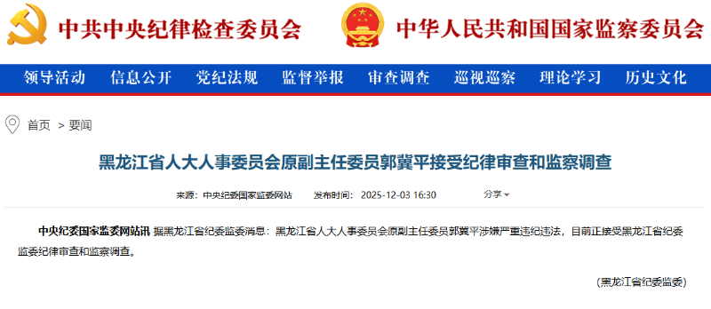 中央纪委国家监委网站讯据黑龙江省纪委监委消息:黑龙江省人大人事委员会原副主任委员郭冀平涉嫌严重违纪违法,目前正接受黑龙江省纪委监委纪律审查和监察调查。