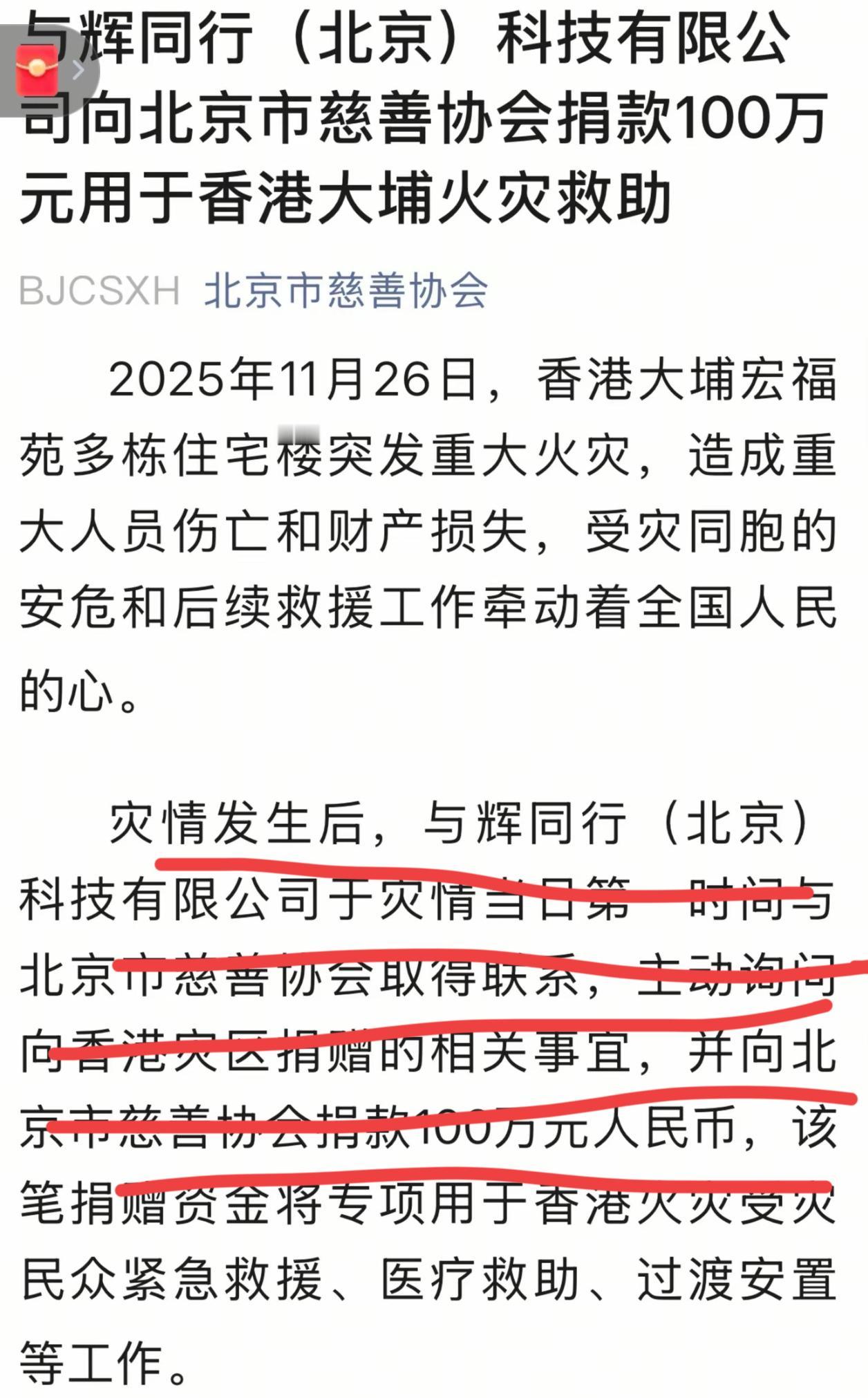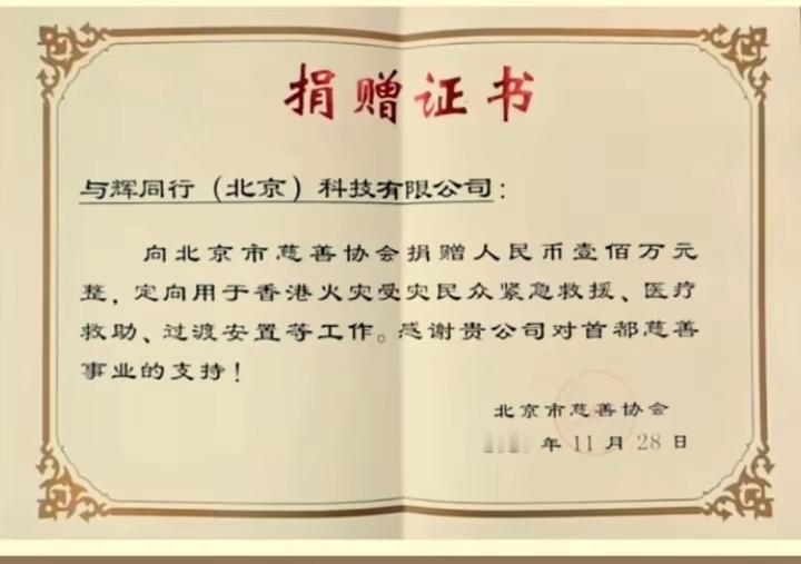 与辉同行的捐款证书被曝光出来了, 这就是实锤! 每次发生天灾人祸的时候, 一些“键盘侠”就跳出来各种道德绑架。 比如去年的海南台风, 今年的贵州榕江水灾, 还有这次的香港火灾, 与辉同行都捐款了。 作为一个企业来说, 与辉同行现在有一定的经济能力, 力所能及的做公益慈善董宇辉也是积极的, 只是他一直比较低调, 他习惯低调做事。 在他的认知里, 力所能及的做公益慈善不是炫耀的资本, 不应该嚷嚷的天下皆知给自己加分, 所以每次他捐款了很多人都不知道。 比如今年夏天北京暴雨, 他就捐款100万用于防汛救灾。 这次如果不是北京慈善机构报道出来, 我们大家都不知道这件事。 香港发生火灾, 有人官宣准备捐款, 而与辉同行没发布任何消息。 所以键盘侠各种带节奏, 质问与辉同行为什么不捐款? 最后媒体报道与辉同行捐款100万, 还是没能堵住他们的嘴。 一些人说捐款100万太少, 还有人说董宇辉是被舆论裹挟才捐款的。 事实真的是这样吗? 真相来了。 北京慈善协会发文了, 文章里面说的清清楚楚, 香港大火发生以后, 与辉同行在当天第一时间就联系了北京慈善协会, 了解捐赠事宜。 这就是官方发布的真相, 他们是第一时间主动联系捐赠, 而不是键盘侠说的因为舆论裹挟呗逼捐赠。 至于那些说捐钱太少的人, 属于那种“文钱不舍,只喜欢看闹热”的网络喷子。 天天道德绑架别人, 自己一分钱都不捐赠! 咋的?一百万还少, 多少才算及格? 你们口口声声与辉同行销量好赚钱多, 又如何? 人家业绩好那是人家的本事, 是他们的真诚得到消费者的肯定。 那是一群年轻人努力换来的, 是他们合理合法挣的, 不是大水打来的。 人家会赚钱就该被你们下任务? 你们为什么不捐? 你们没钱? 为什么啊? 你们也可以像董宇辉这样去挣啊, 那么多直播间, 为什么他们的人气业绩好, 而人家的不行? 都是第一次做人, 为什么董宇辉做了老板, 他做慈善捐赠帮助他人, 而你们只能做键盘侠攻击别人? 这个世界怎么了? 谁有本事就活该被你们指责, 没钱没本事就可以理直气壮指责别人? 看清楚, 董宇辉不是没捐款, 而是不习惯像人家那样准备捐款前发一个海报, 捐款以后御用媒体再来一次报道。 有些人喜欢做点芝麻绿豆大的事情都要昭告天下, 而董宇辉低调做人, 这就是格局。 散会! 董宇辉