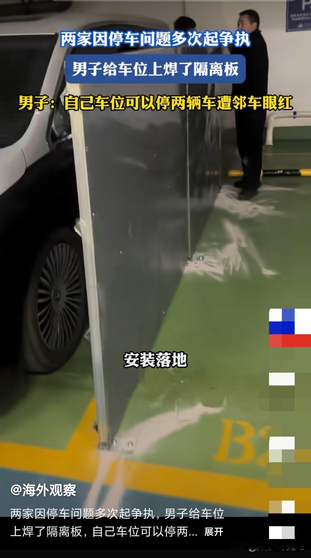 买了个车位,靠墙的位置比其他车位宽了不少,却遭到同车位车主嫉妒,隔三差五挑事,说他车子停进去开门不方便,让往里面挪一挪好给他腾多点空间。 这事发生在浙江杭州某小区,男子买了个车位靠墙面多出空位置,被隔壁车主嫉妒,并到物业投诉男子。 两人因此多次有过争执,无奈之下,男子花钱请人在两人停车位之间装上了隔离板。 从视频中不难看出,男子装隔离板特意安装在自己黄线里,人和人相比格局立马出来了。 嫉妒果然容易使人发狂。
