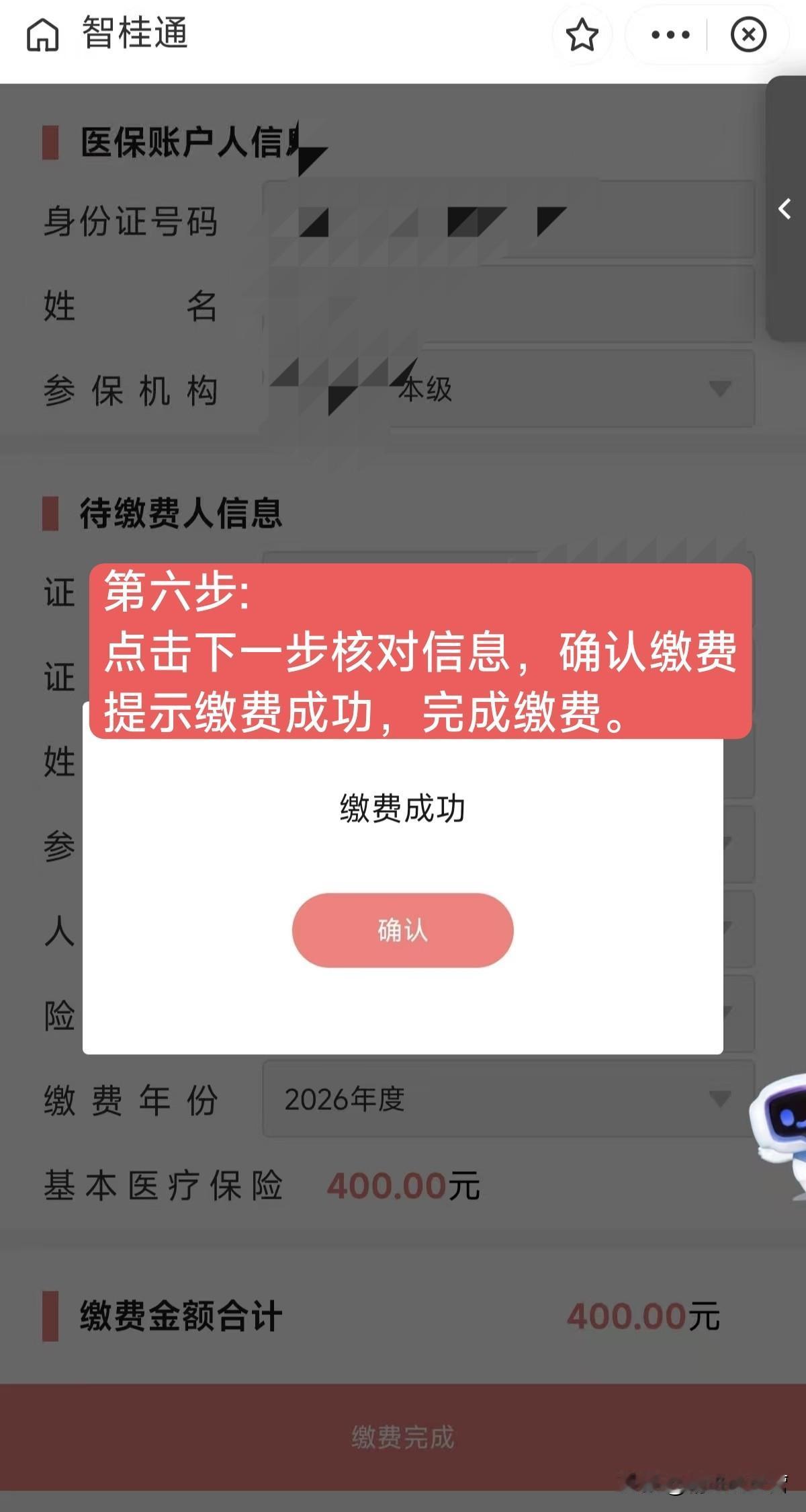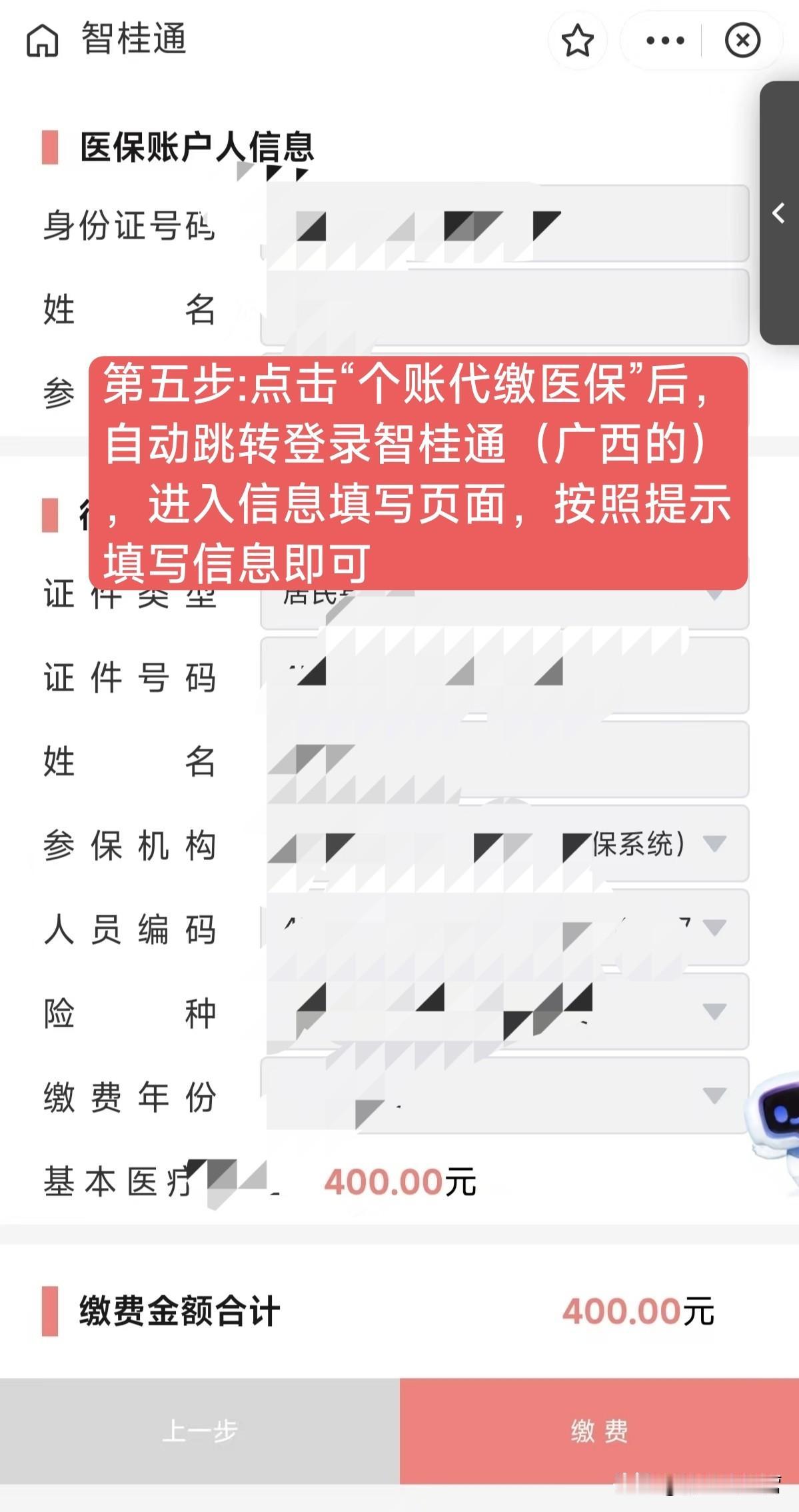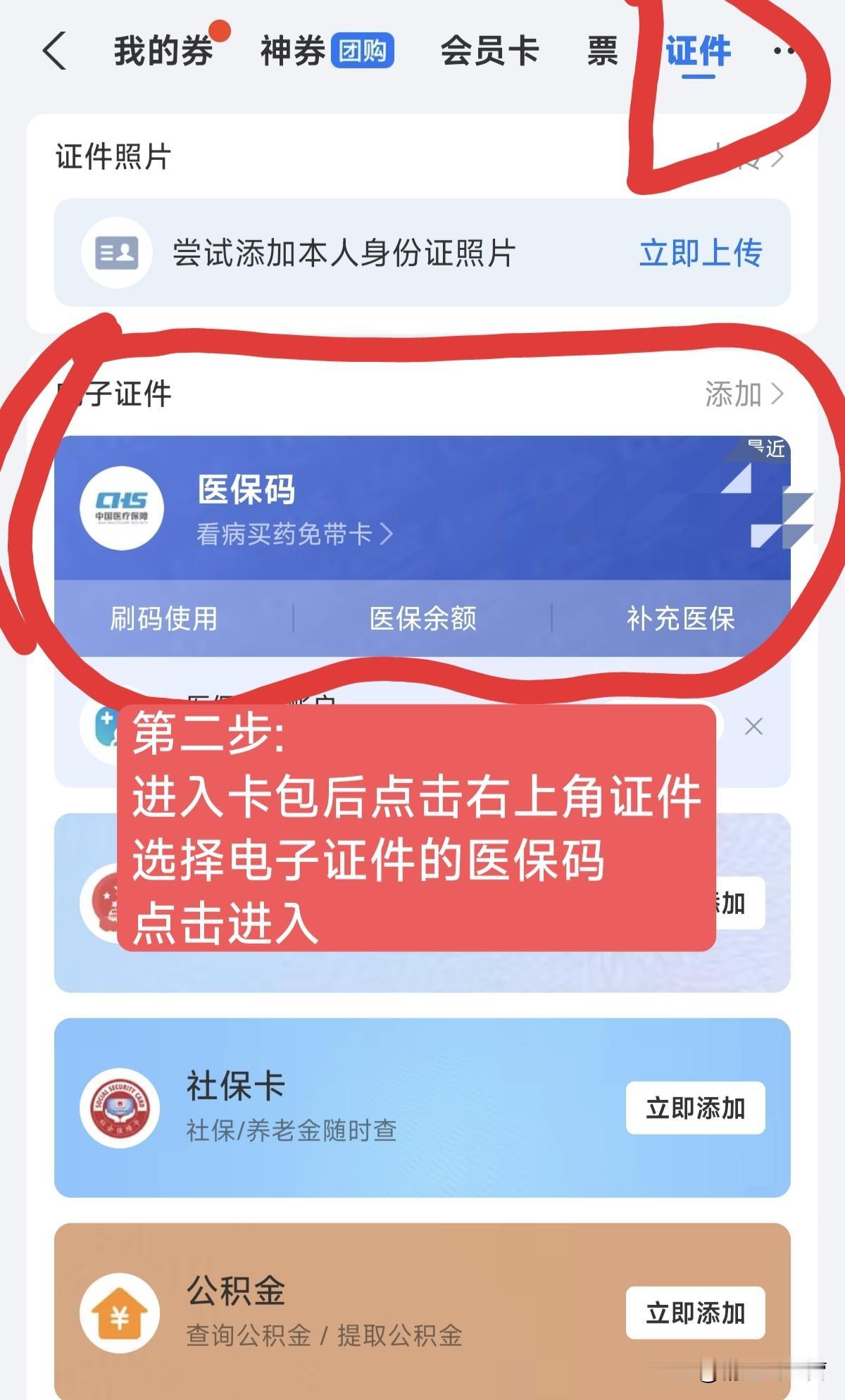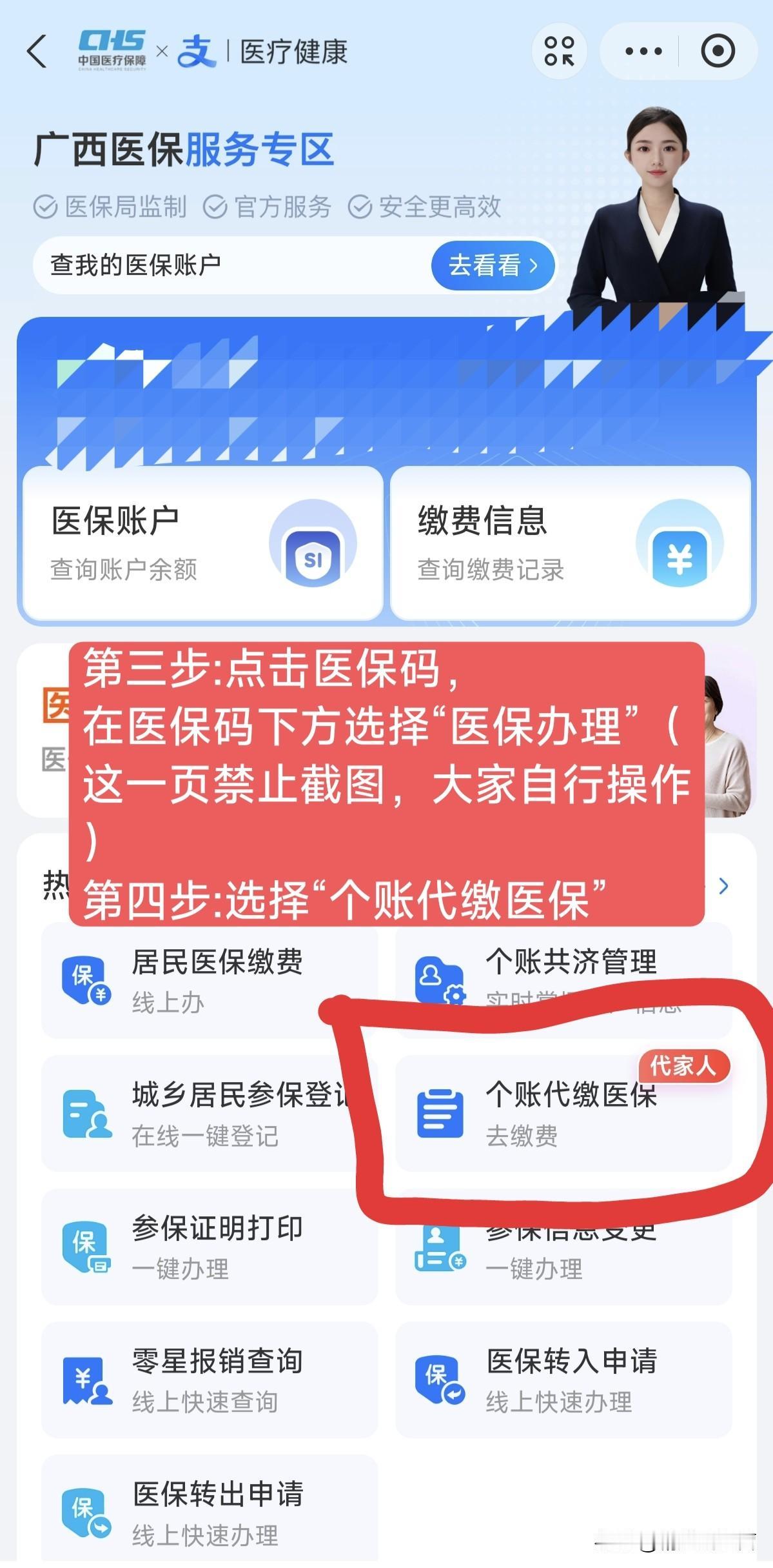 手把手带你使用医保卡余额代家人缴纳城乡医保。 具体步骤如下: 第一步:登录支付宝首页,点击右上角的“卡包”。 第二步:进入卡包后点击右上角的“证件”,选择电子证件的医保码,点击进入。 第三步:在医保码下方找到“医保办理” ,点击进入。 第四步:在医保办理页面选择“个账代缴医保”。 第五步:点击“个账代缴医保”后,接受平台提示的权限 ,自动跳转到智桂通(广西的是这个平台)页面,要提示填写信息即可。 第六步:点击下一步核对信息,等信息核对后,点击缴费,确认缴费,出现“缴费成功”提示说明已成功帮助家人代缴医保。 手机医保缴费