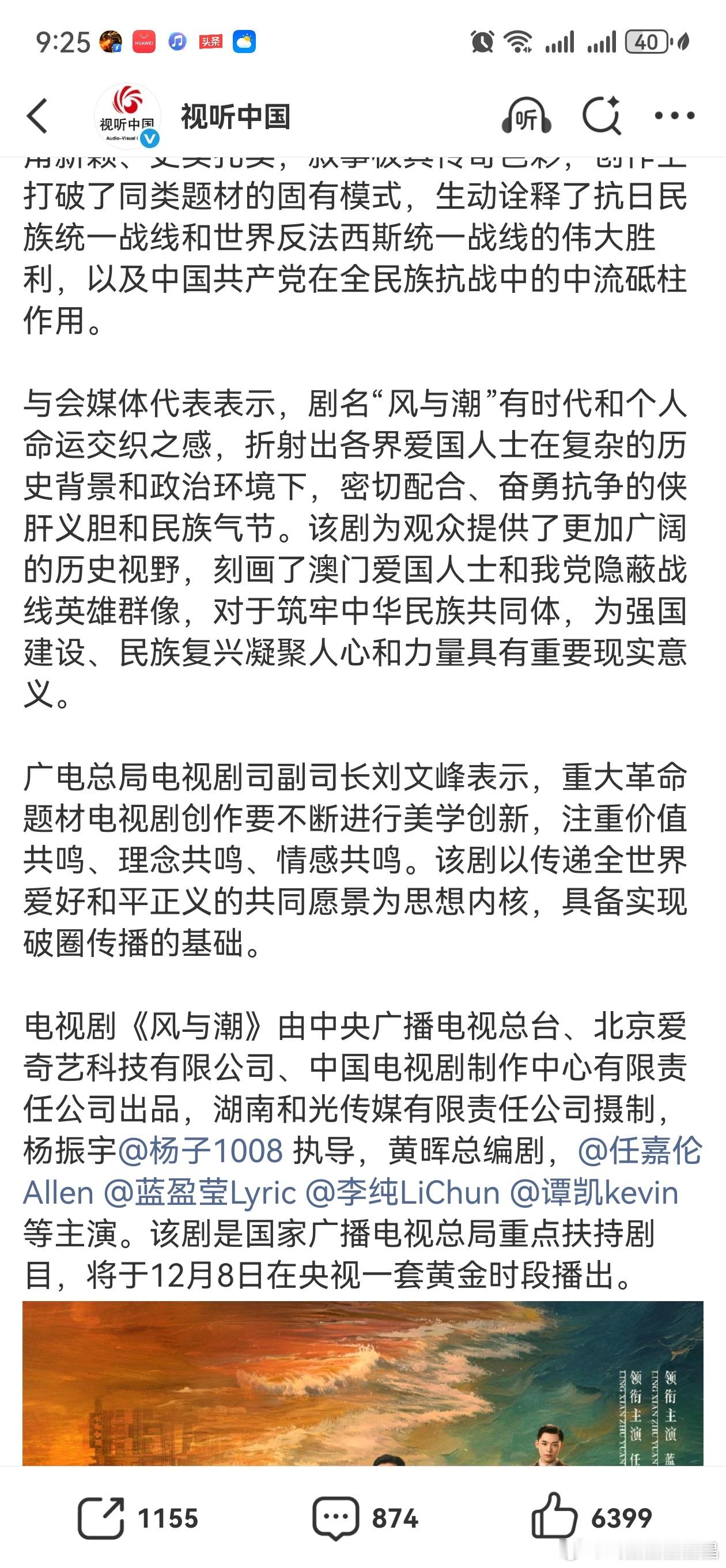 广电亲自给电视剧《风与潮》定档了:12月8日央视一台黄金档! 任嘉伦风与潮