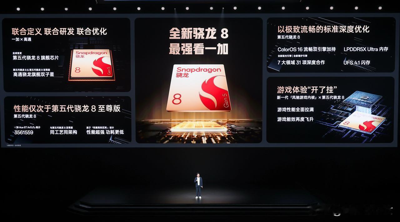 全新骁⻰ 8,最强看⼀加! 一加Ace6T 全球首发第五代骁龙8旗舰芯片。该芯片由一加与高通联合定义、联合研发、联合优化,双方在性能、游戏、影像等7大领域31个专项深度联调,全面优化用户体验。第五代骁龙8全面沿袭第五代骁龙 8 至尊版的顶级实力,采用行业最领先的第三代3nm制程工艺,第三代Oryon CPU 架构、最新一代Adreno GPU,拥有超强性能与能效,安兔兔跑分高达 356 万,性能稳居行业第一梯队。 在此基础上,一加还将独家新一代「风驰游戏内核」写入芯片底层,配合自研潮汐架构与极光引擎,确保游戏与日常使用全程流畅。为支撑顶级性能,除了搭载第五代骁龙8处理器,一加 Ace 6T采用 LPDDR5X Ultra+UFS 4.1 组合,构成最新旗舰性能铁三角,即使多任务、重载游戏或4K剪辑也流畅无阻,实现全场景高性能体验。