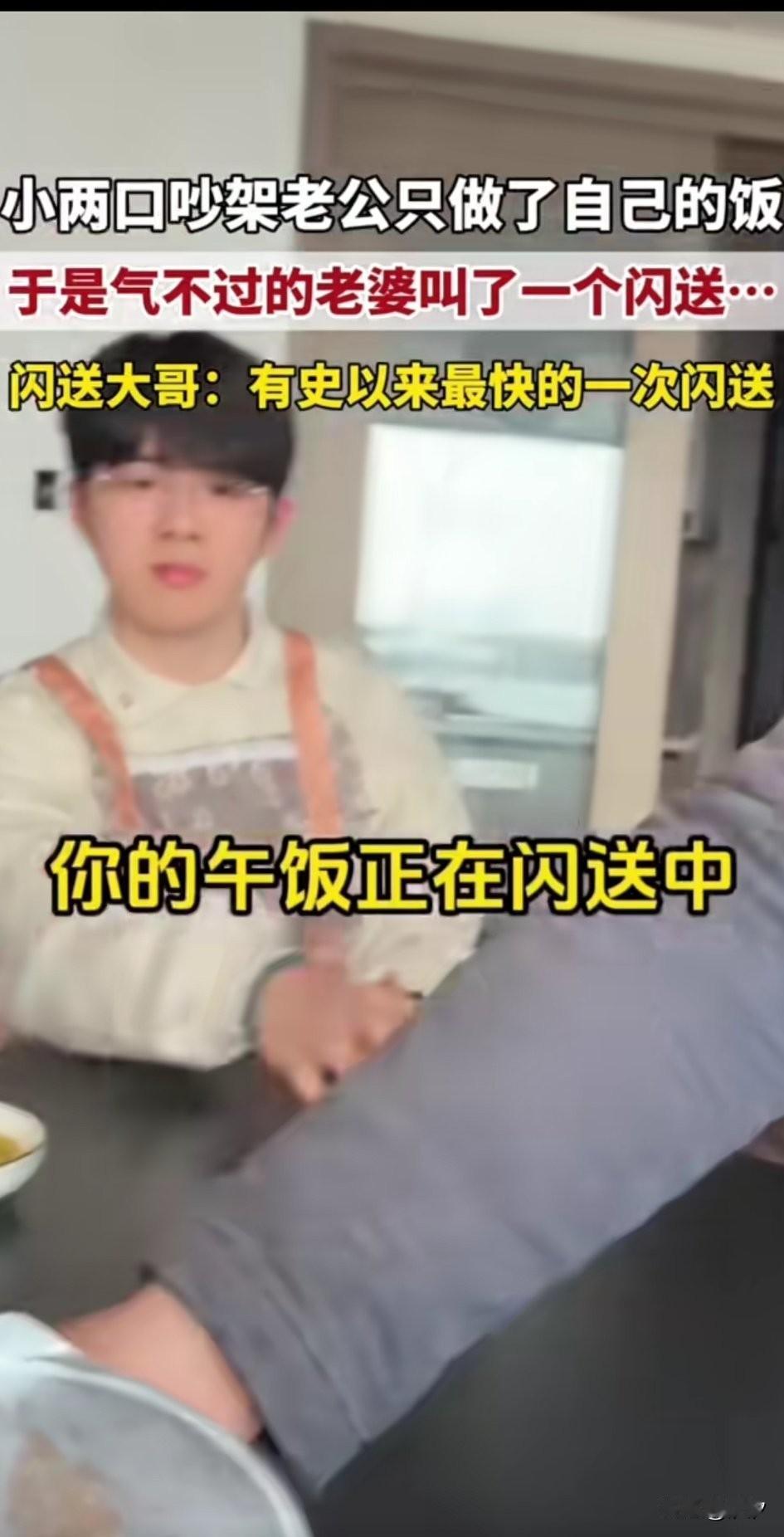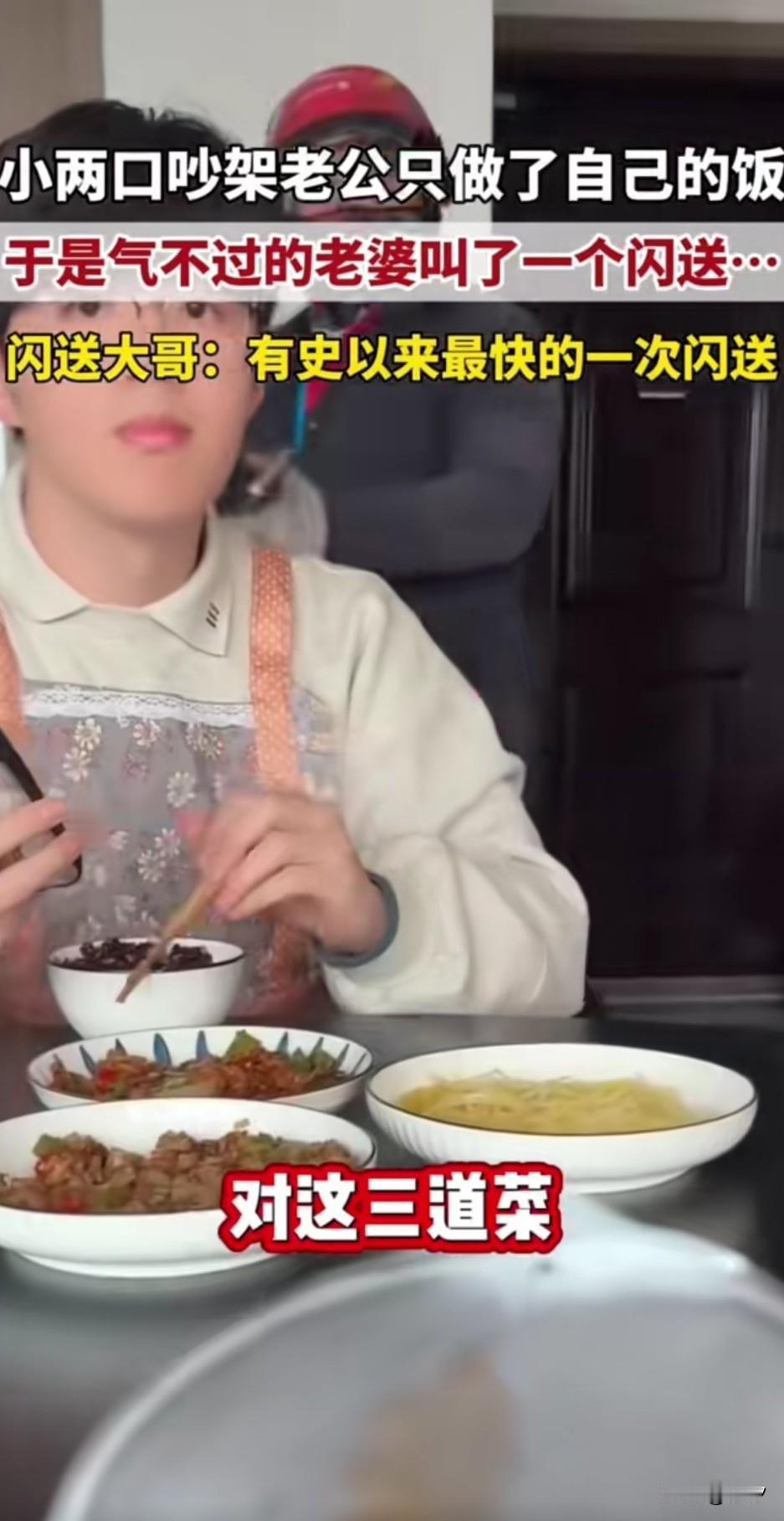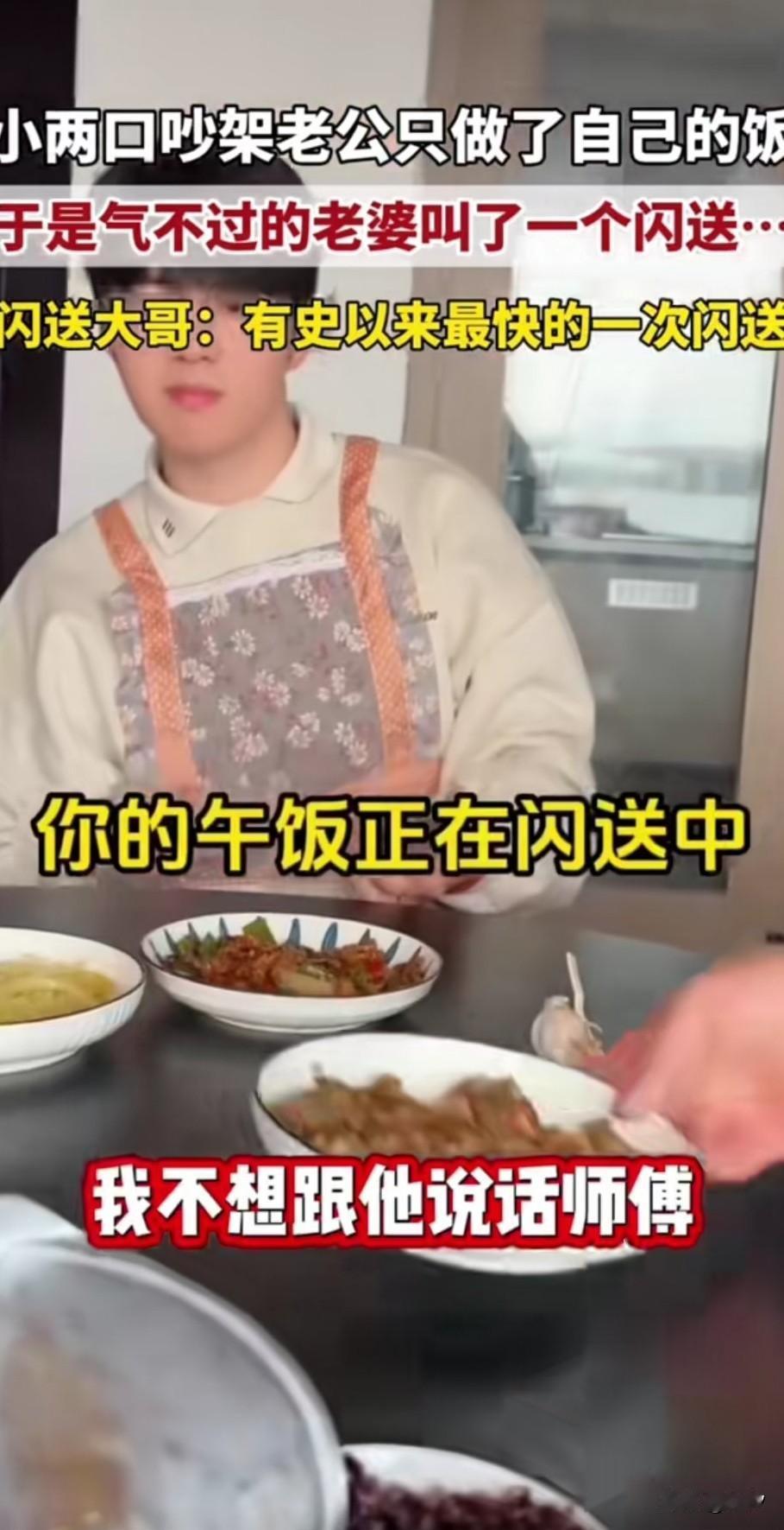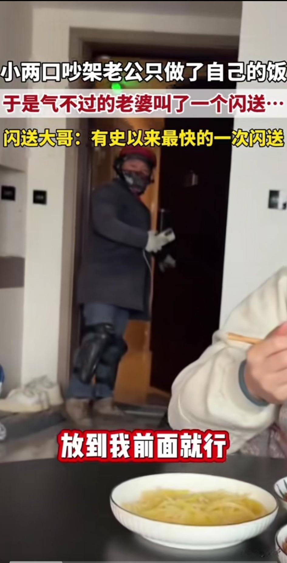 小两口吵架, 老公只做了自己的饭, 女子气不过, 于是叫了个闪送, 闪送师傅接单