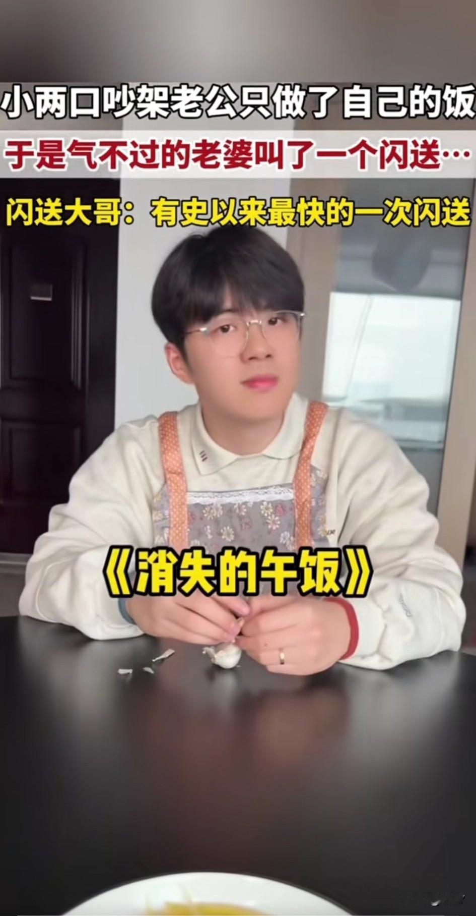 小两口吵架, 老公只做了自己的饭, 女子气不过, 于是叫了个闪送, 闪送师傅接单后很快上门, 女子让师傅直接进来, 说让他送的饭就在桌子上, 把男子的饭放在自己面前就可以了, 闪送师傅简直不敢相信自己的耳朵, 这肯定是他送过距离最短的单子, 将饭菜从一个人的面前挪到另一个人的面前,师傅战战兢兢的完成了这一单, 女子告诉了师傅自己不想和老公说话, 老公也是震惊的看着女子, 没有想到自己的媳妇儿会这么干, 对于老公来说是消失的午饭, 对于闪送师傅来说这是有史以来最快的一单闪送! 现在的小两口还真会玩! 大家对于女子和老公吵架这样做怎么看? 婚姻与家庭 闪送跑单 饿了么闪送 上海闪送 闪送趣事