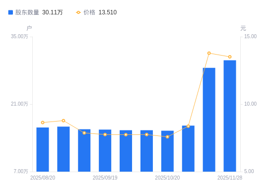 日期A股户数(户)流通A股户均持股数(股)户均持股市值(万元)2025-11-283011455274.377.132025-11-202853625566.097.672025-10-311655909592.078.032025-10-2015485810256.827.772025-10-1015592510186.637.892025-09-3015602310180.237.882025-09-1915725110100.747.832025-09-1015793510056.997.912025-08-291633169725.638.542025-08-201616369826.718.49