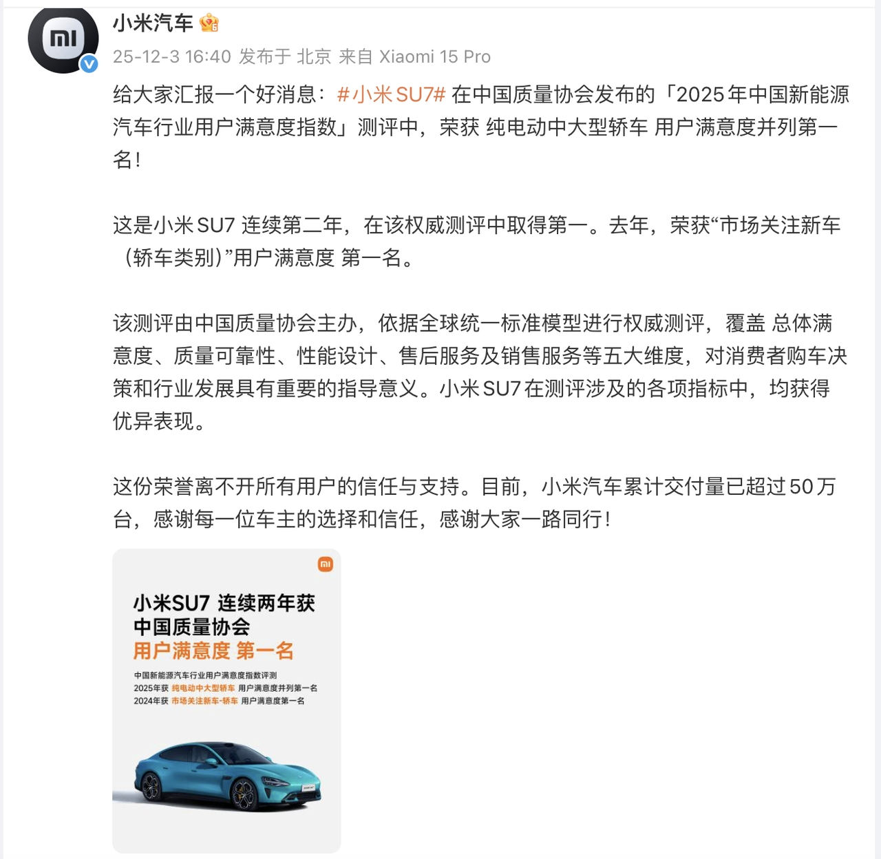 按含金量来看,小米去年那个“市场关注新车”第一肯定不如今年这个“纯电动中大型轿车”高。这个两个第一,代表了小米成功把热度转化成了口碑,用过硬的质量拿到了实力派的身份,而且这个质量也不止说的产品,用户满意度测评是还要考验销售和售后服务,网络舆论的声量大小,和用户真实的反馈,这两项谁更有含金量,相信大家心里自然也是清楚的。雷军回应小米SU7再获满意度第一