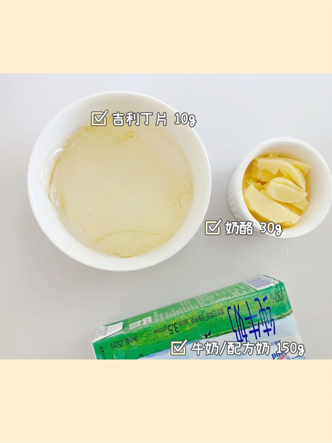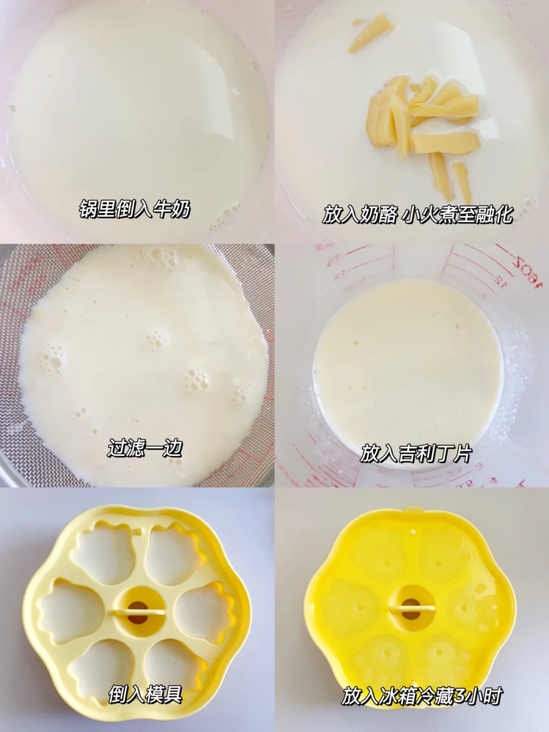 1⃣️牛奶倒入锅里,放入奶酪小火加热搅拌至融化,过滤一遍
