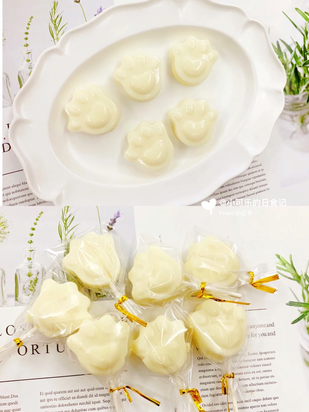 2⃣️晾至微凉放入吉利丁片,搅拌均匀,倒入猫爪模具八九分满,盖上盖子放入冰箱冷藏3小时后脱模即可