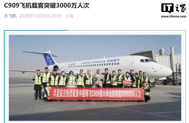 IT之家12月3日消息,中国商飞公司“大飞机”公众号官宣,12月3日,在喀什飞往伊宁的华夏航空G54969航班上,C909飞机迎来了第3000万名乘客。
