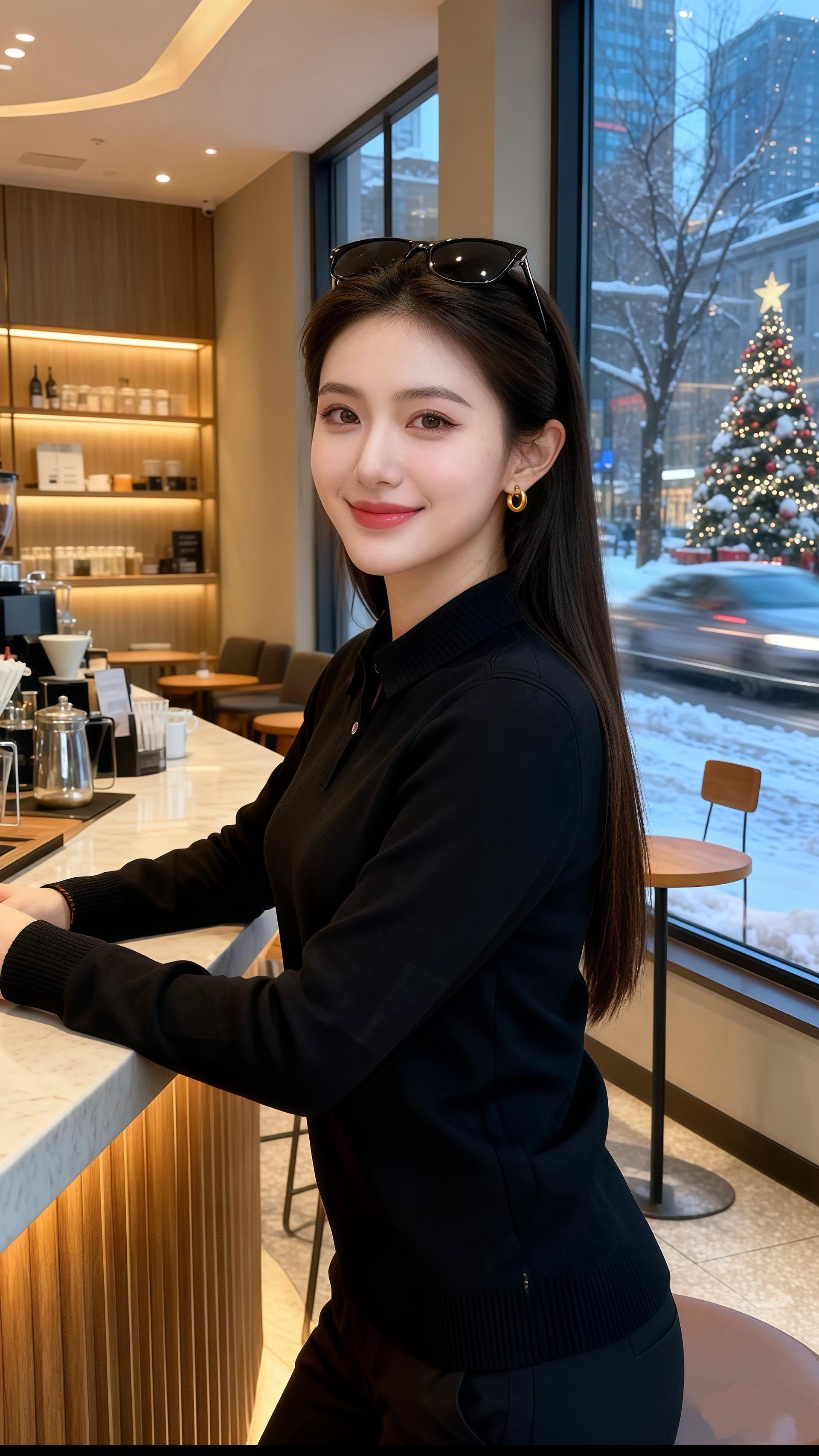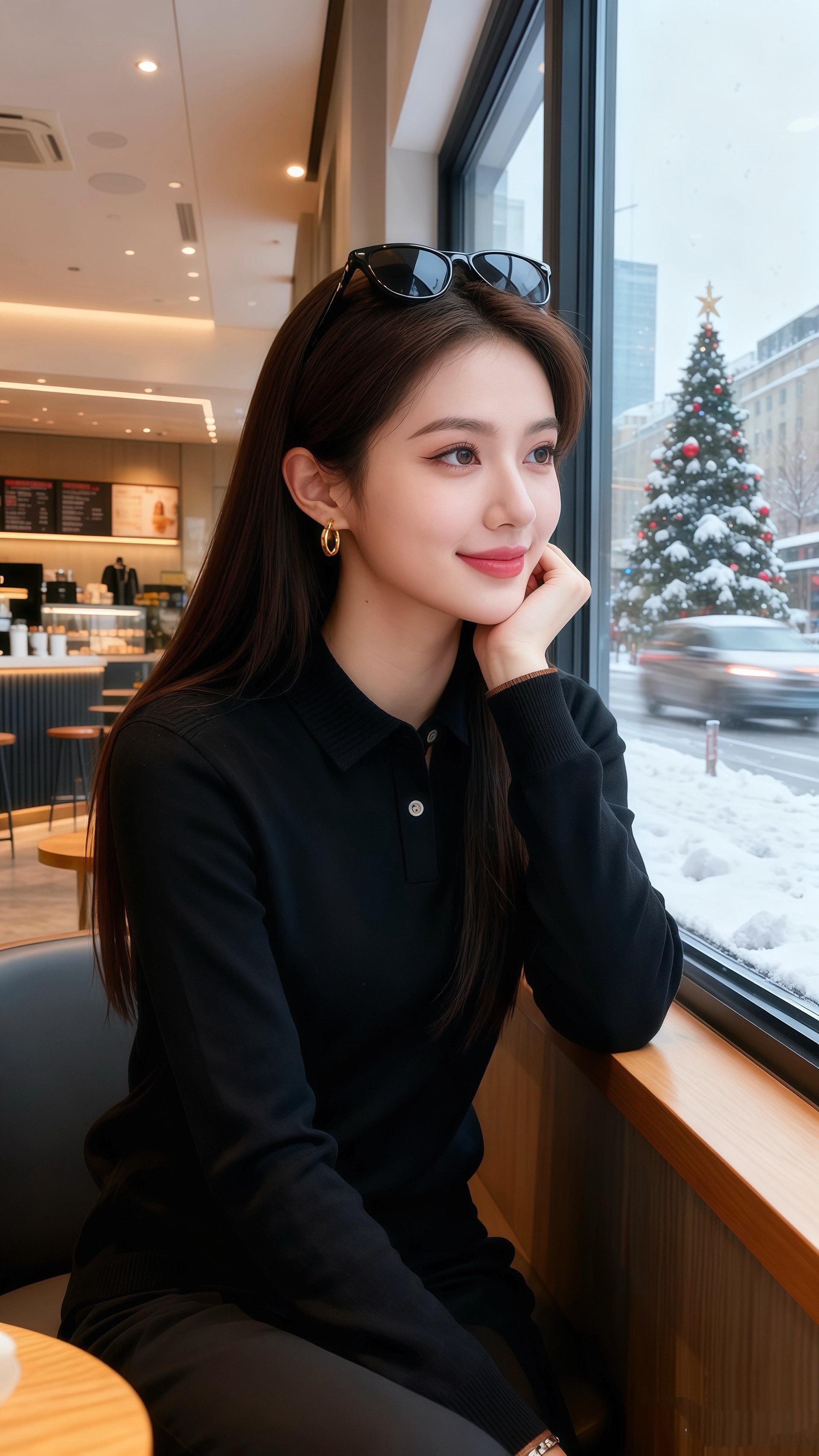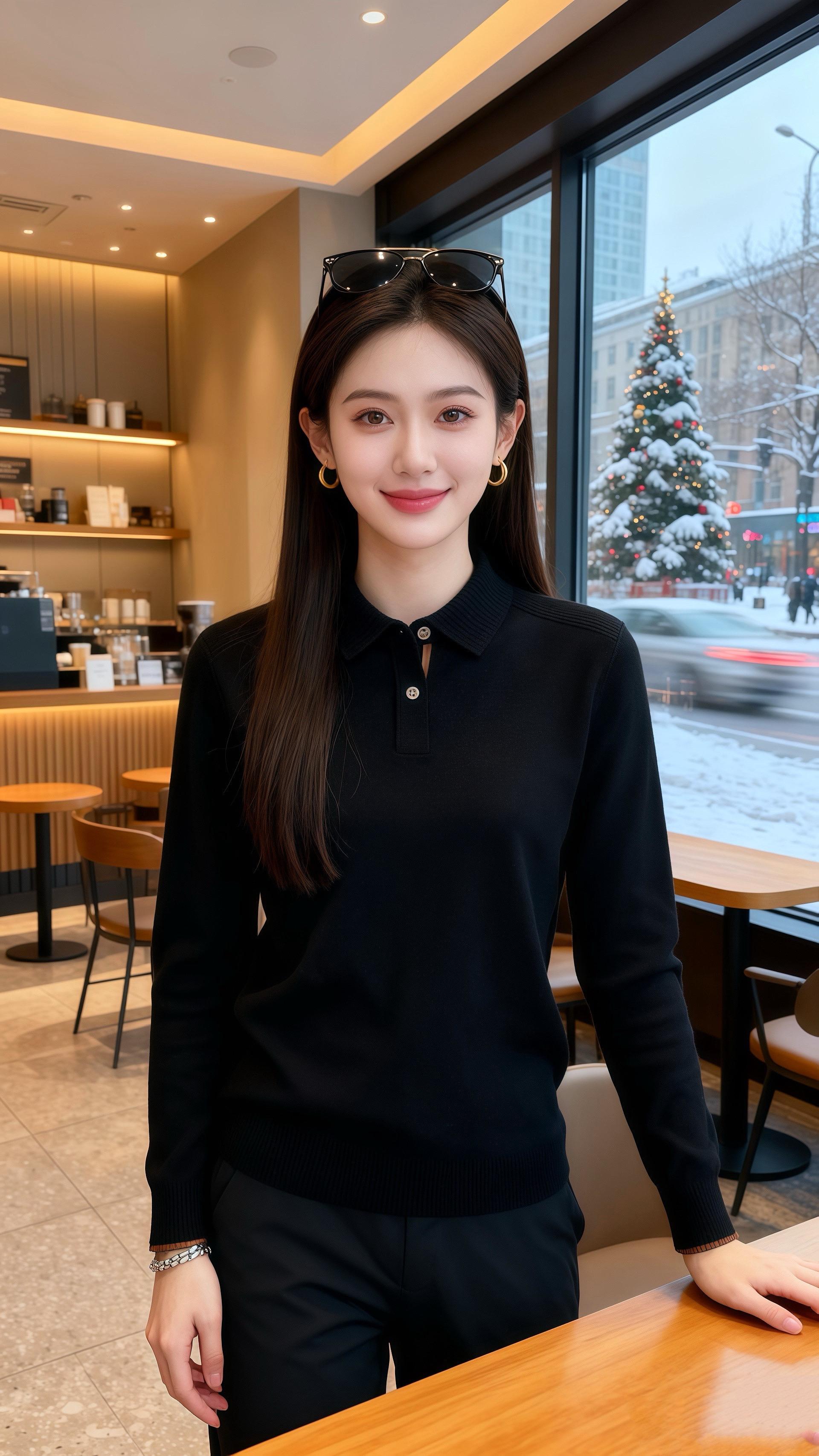雪粒敲着咖啡馆的玻璃时,许妍正手肘抵着窗沿望出去——黑色Polo领针织衫的纽扣扣到第二颗,细腻的针织纹路顺着肩线弯出温弧,同色系的裤子衬得身形利落,沉黑的调调揉着冬日的冷光,像把街景的繁闹都压成了简约的质感。