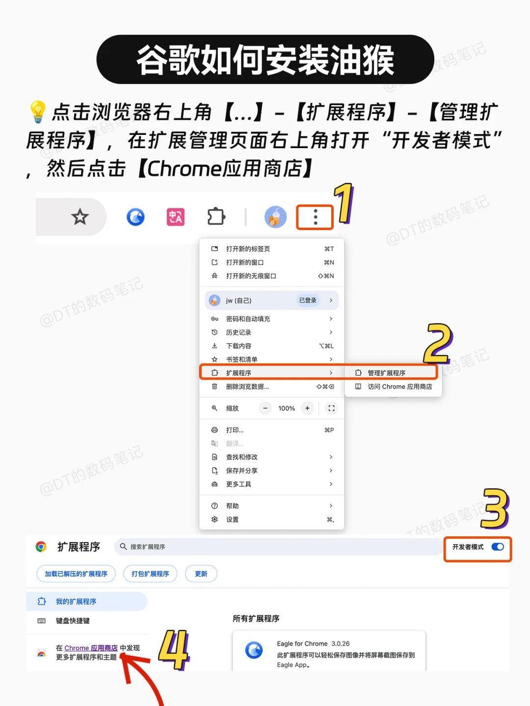 谷歌:点击浏览器右上角【…】-【扩展程序】-【管理扩展程序】,在扩展管理页面右上角打开“开发者模式”,然后点击【Chrome应用商店】-在搜索栏🔍篡改猴,点击“添加至Chrome”即可完成❗️
