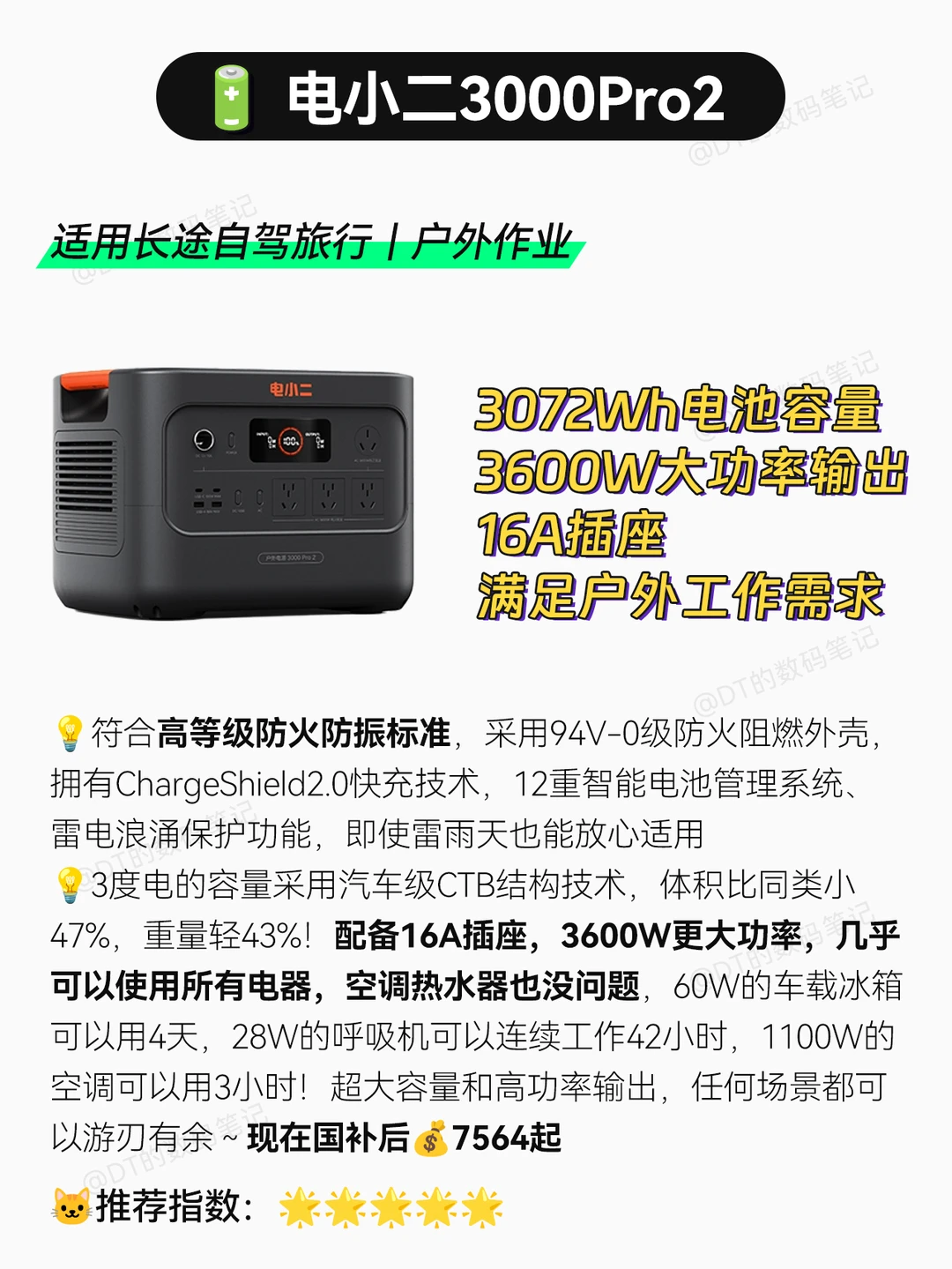 长途自驾、户外作业,如果家里有不能断电的需求如使用呼吸机、鱼缸用电等需求,强烈建议上3000Pro2❗️3度电的容量采用汽车级CTB结构技术,体积比同类小47%,重量轻43%!3600W更大功率,几乎可以使用所有电器,配备16A插座,空调热水器、切割机都可以使用,60W的车载冰箱可以用4天,28W的呼吸机可以连续工作42小时,1100W的空调可以用3小时!
