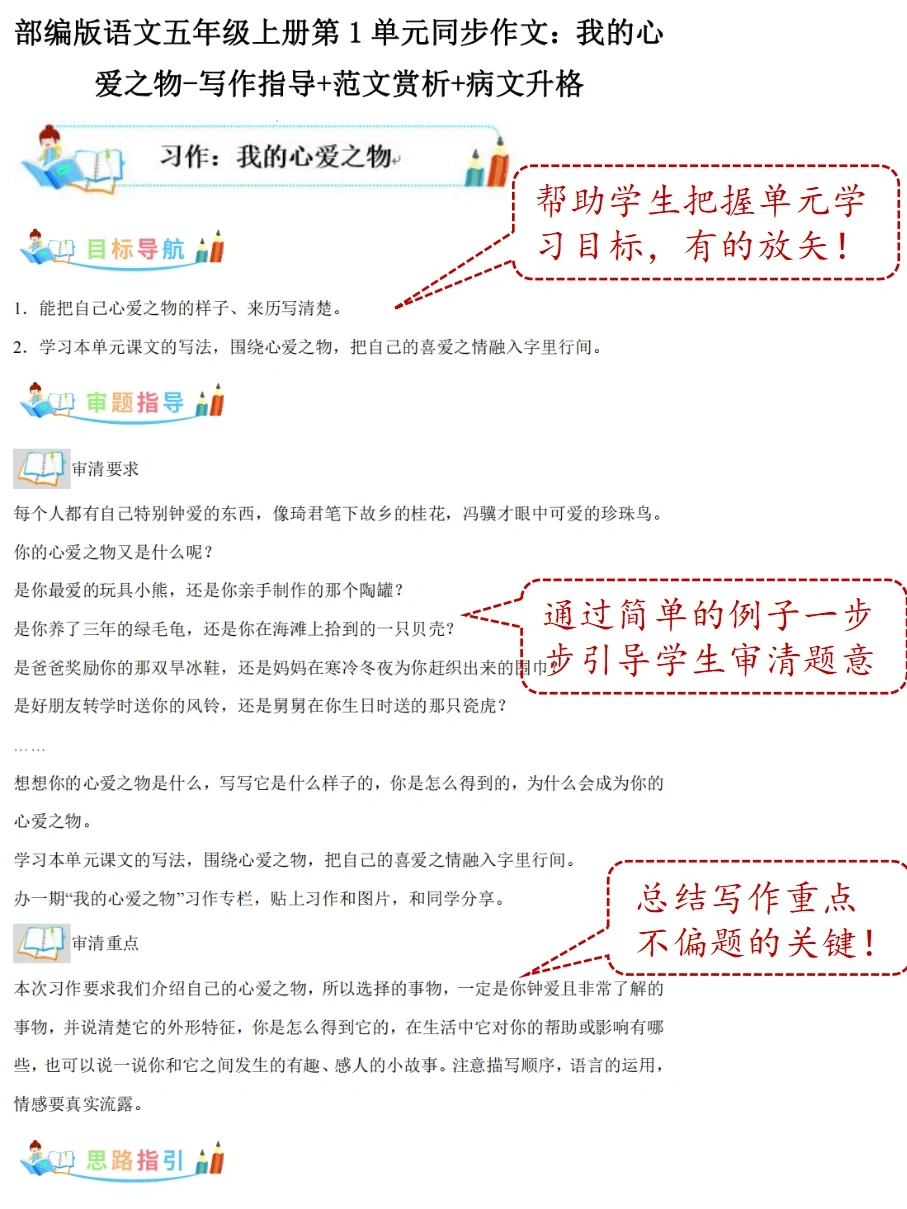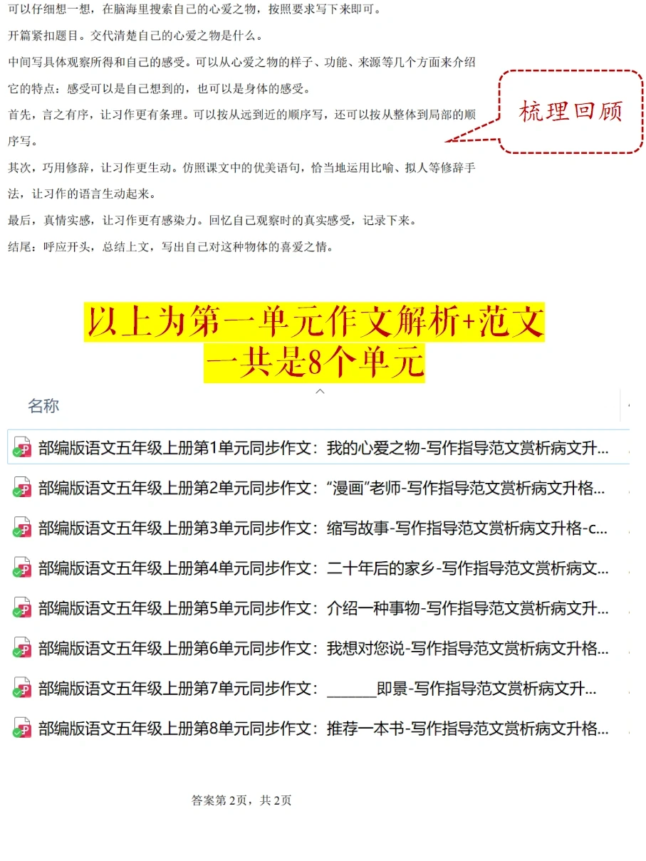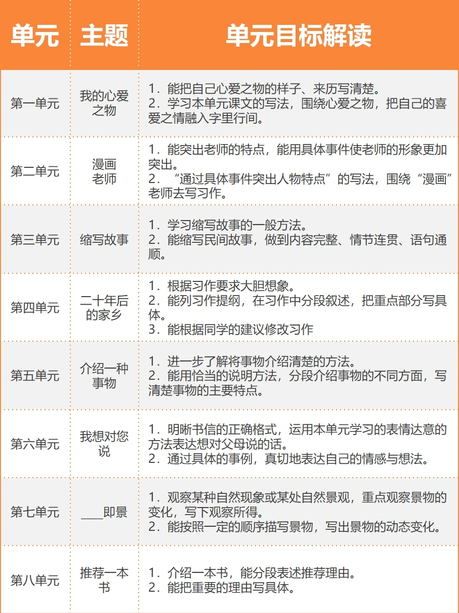 为了解决这个问题,我整理了这份笔记,笔记的逻辑很简单:对于小学生,写好单元作文就已经很好了!所以,从每个单元的题目出发,一步一步带你写好作文,储存自己的范文。