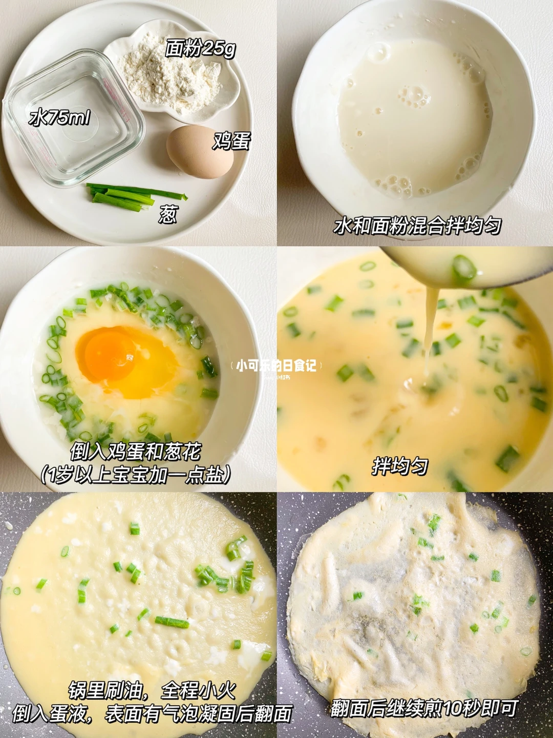 今天分享可乐早餐爱吃的鸡蛋水饼,软软嫩嫩,简单好做,没牙宝宝也能吃,不爱吃鸡蛋的宝宝一定要试试,分分钟光盘。5分钟轻松搞定宝宝的早餐! - 🥣食材:鸡蛋1个面粉20g清水75ml小葱适量 👩🍳做法: 1⃣️先把清水和面粉混合搅拌化开,再打入鸡蛋和葱搅拌均匀,呈流动的状态 2⃣️平底锅刷油,全程小火,倒入面糊,一次不要倒入过多面糊,摇动锅让面糊均匀 3⃣️蛋饼表面有气泡,让它定型一下再翻面,翻面后再煎10秒即可