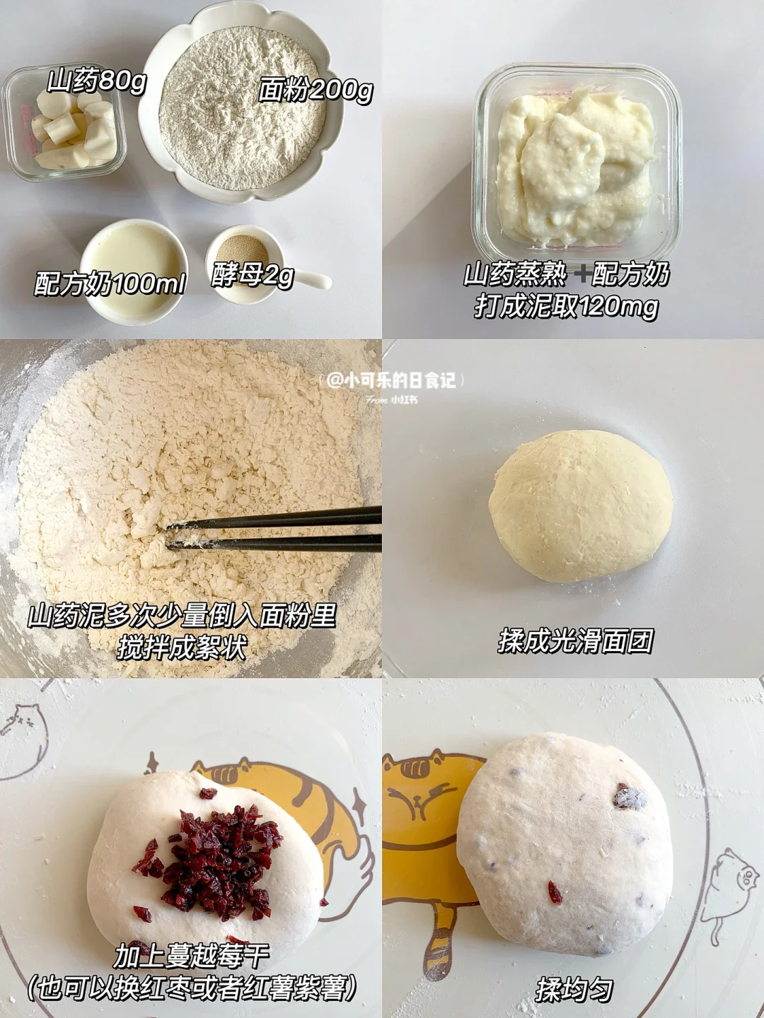 1⃣️山药蒸熟➕配方奶打成泥,取120克,蔓越莓干切小备用