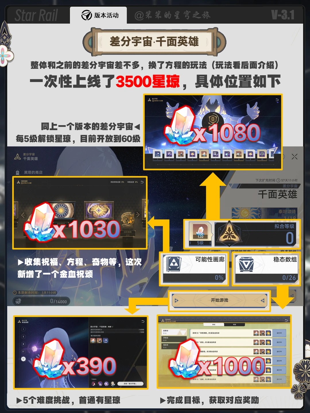 🐱大家好,我是笨笨的铲屎官 今天给大家带来的是 3.1新上线的差分宇宙·千面英雄 整体和之前的差分宇宙差不多 就是新增了一个白天黑夜的环境系统 而且多的攻略攻略可以直接推荐配装 所以萌新再也不用记配置了 系统会直接推荐并标记,非常好用