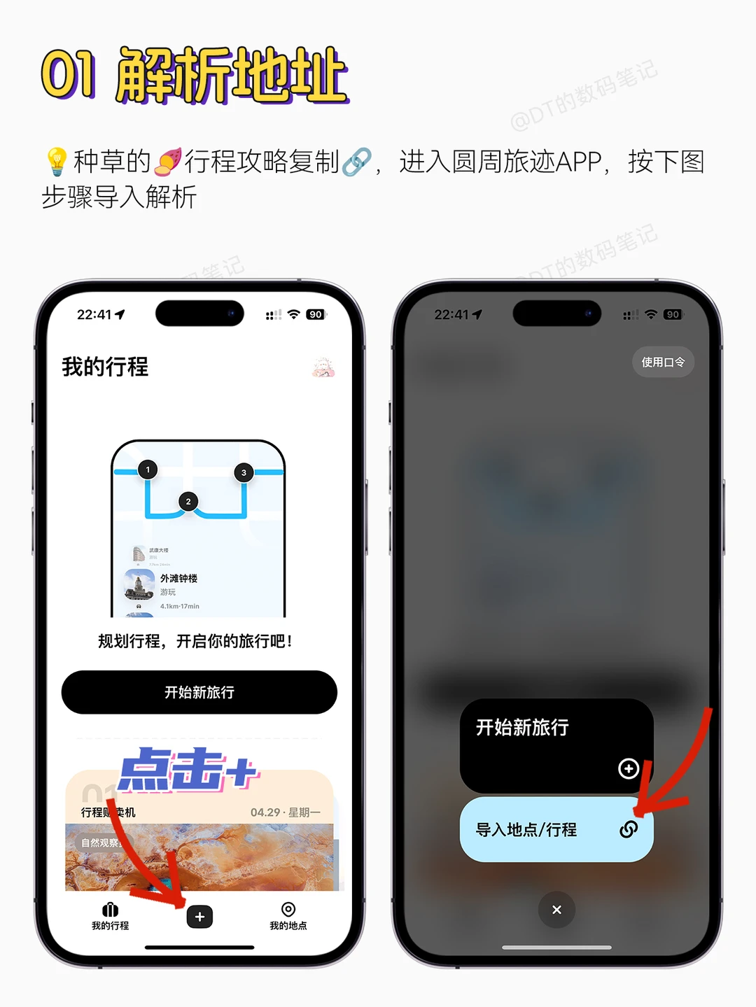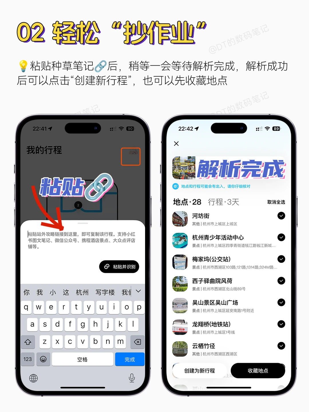 将种草的行程攻略一键复制链接至圆周旅迹,自动解析笔记内容,生成地点库,最后简单两步操作就可完成旅行动线,轻松实现“抄作业”!