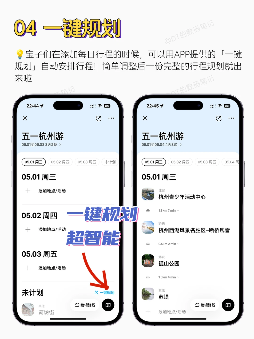 宝子们在添加每日行程的时候,可以用APP提供的「一键规划」自动安排行程!简单调整后一份完整的行程规划就出来啦