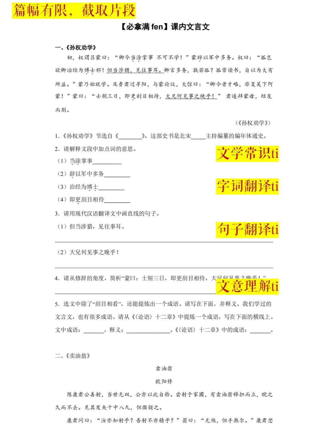 2、文言文板块:5篇课内文言文理解ti
