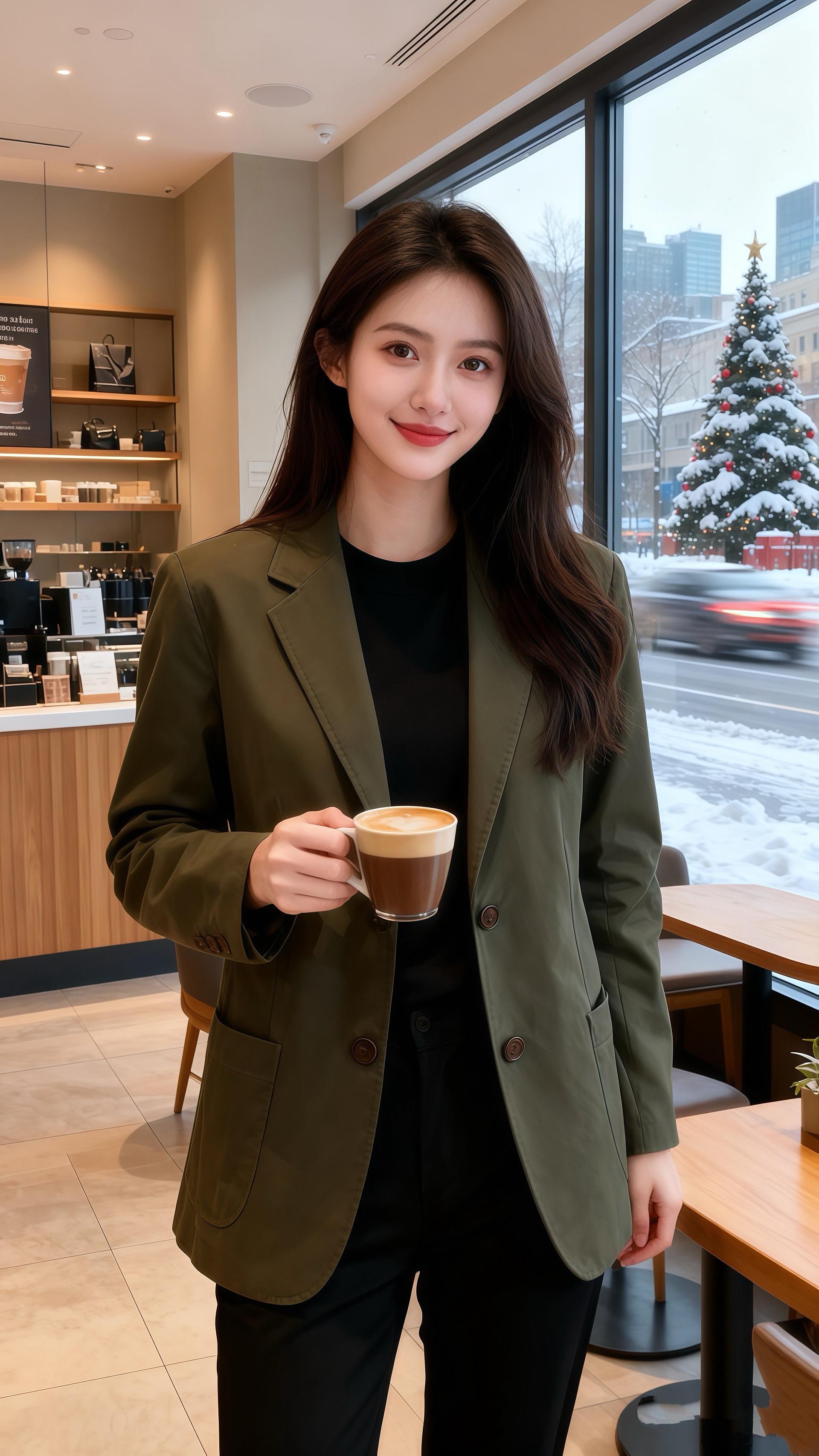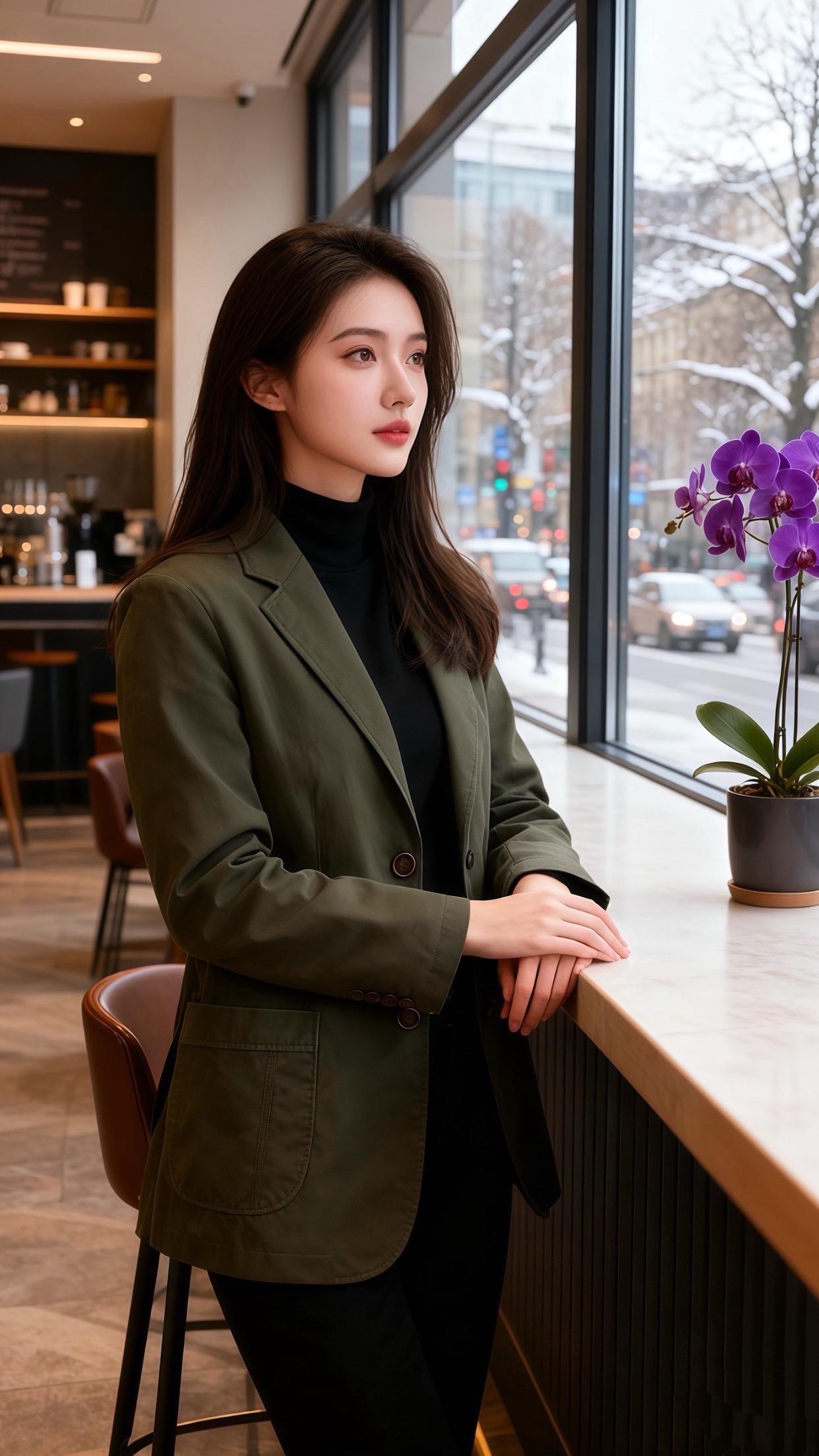 她穿的橄榄绿西装外套,版型宽松却不拖沓,翻领的设计勾勒出利落的肩线,内搭黑色高领打底,深浅色系的搭配在冬日里显得格外有层次。西装面料带着细腻的肌理感,单排扣的设计随意敞开,搭配黑色长裤,把职场的干练和日常的温柔揉得恰到好处。