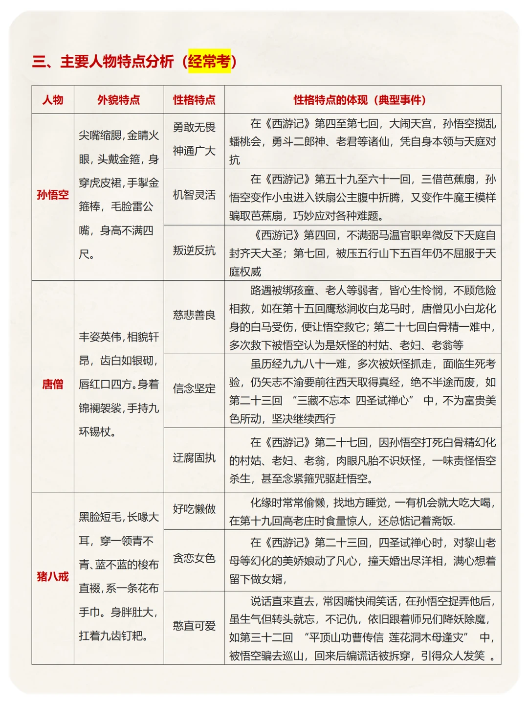 3、孙悟空、唐僧等主要人物的形象特征及其事件
