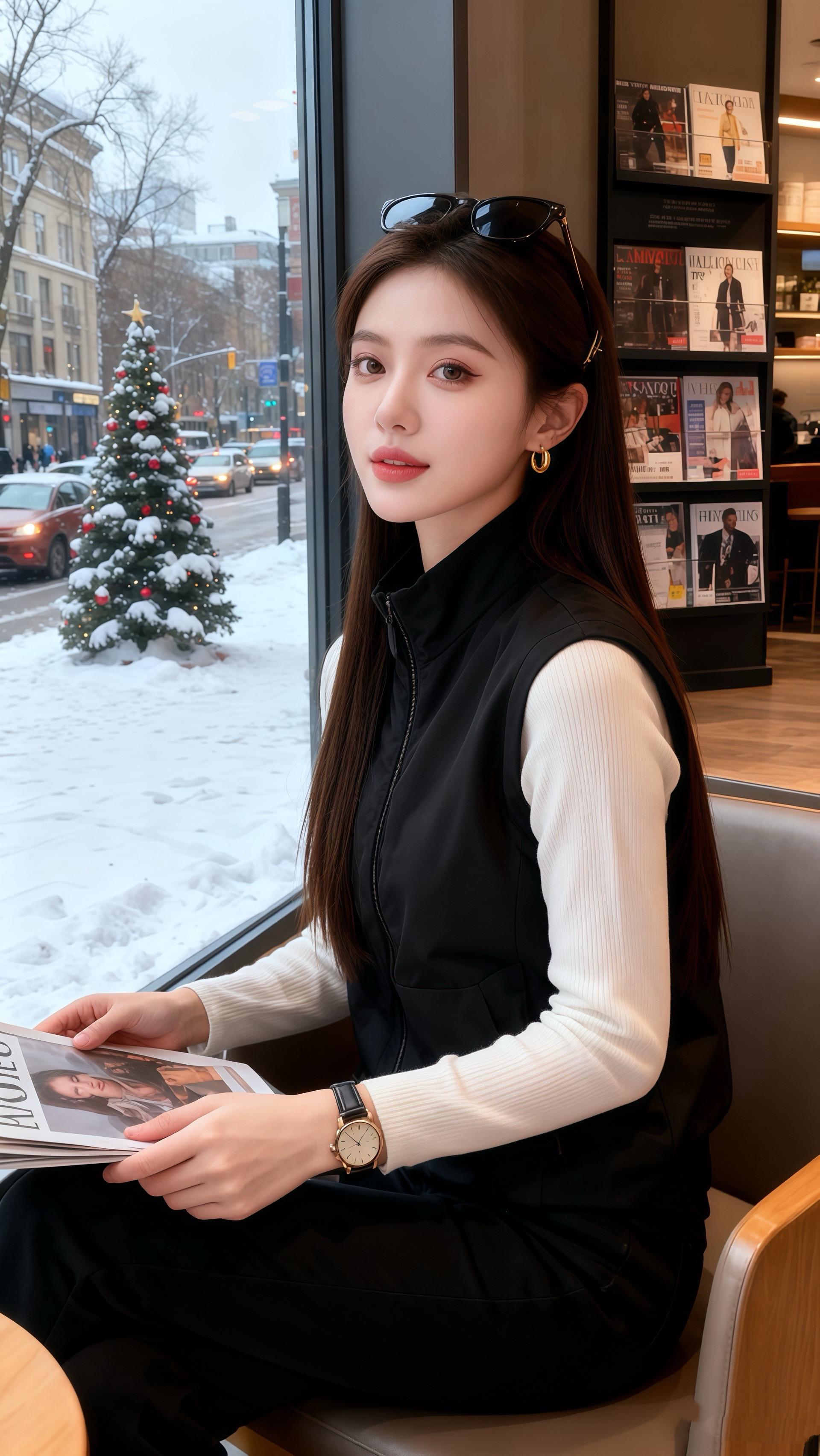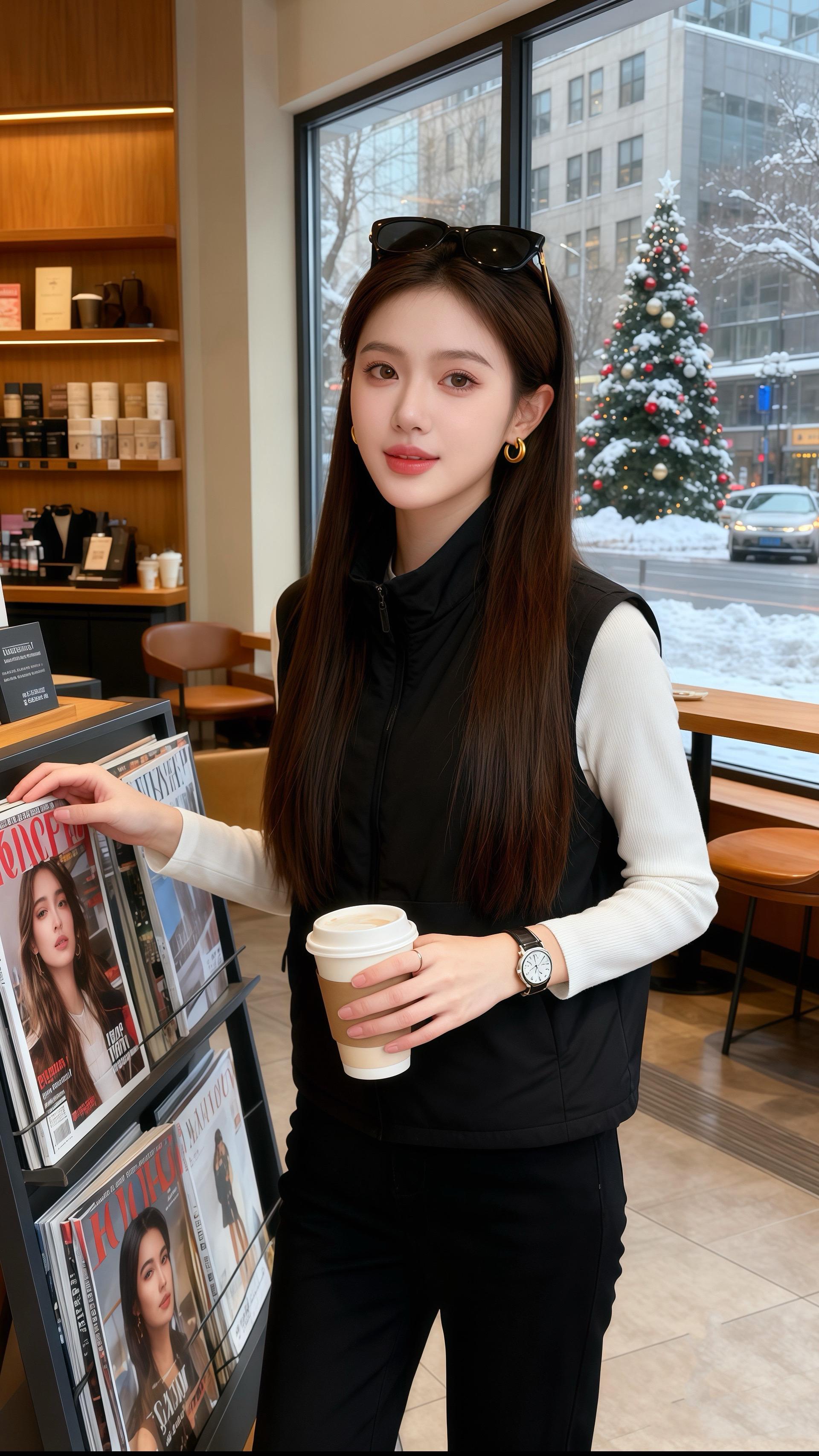 圣诞雪落满街时,皓明推开咖啡厅门,视线先撞进许妍的黑色马甲里——立领衬得她颈线清瘦,白色打底衫的纹路顺着手臂软下来,墨黑裤脚裹着踝,腕间的表链在杂志封面上泛着细光。