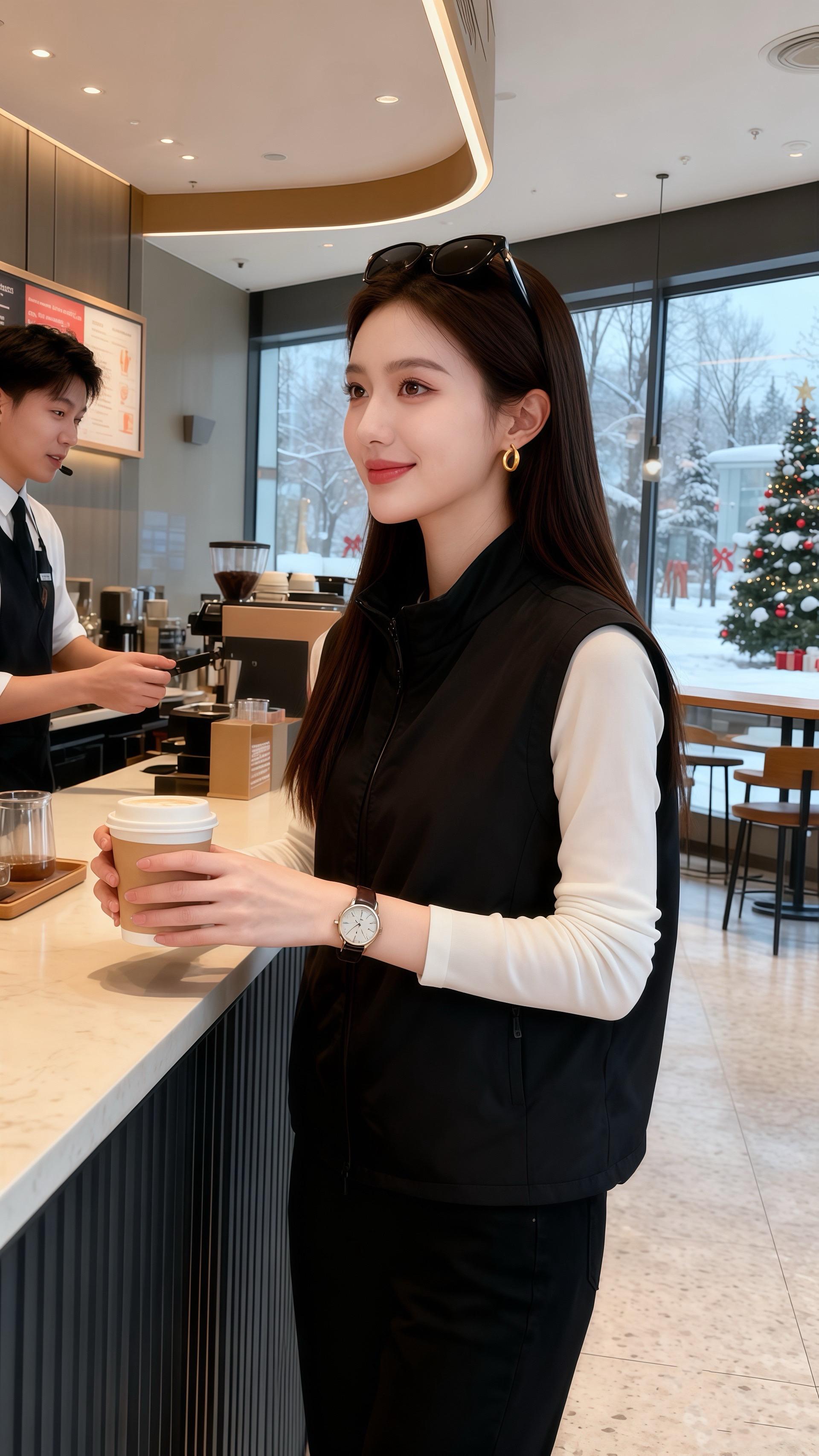 后来他总掐着她买咖啡的点来,看她靠在窗边时,马甲领口露出的白边裹着颈线,发梢垂在金色耳饰上,窗外的车流和圣诞树都成了衬。某次她踮脚取杂志架顶层的刊,马甲下摆晃了晃,他忽然说:“第一次见,我觉得这一身