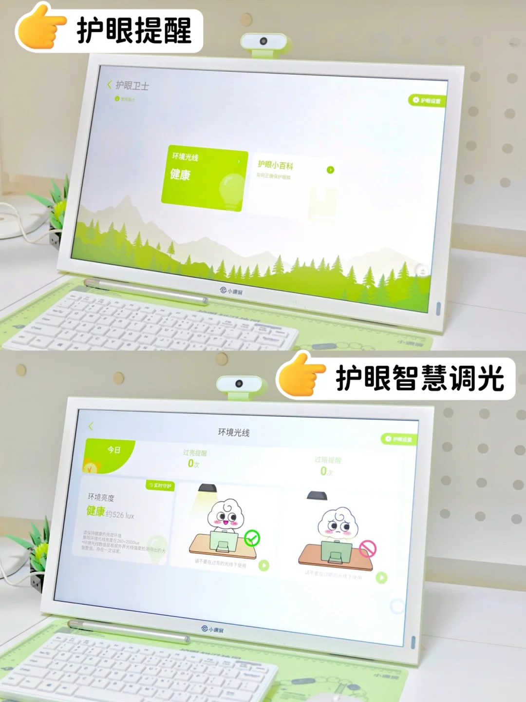 👉软件上,通过AI检测环境,可以自动调解屏幕亮度,还能贴心的提醒用眼时长和亮度。大宝学习时看到上面显示环境太暗就会自己开台灯,放心多了。里面带个电子视力表,在家能随时随地测视力,给宝宝生成个视力健康档案,方便观察孩子视力情况,而且里面还有很多干货满满的护眼小百科,宝妈和孩子都应该赶紧学起来。