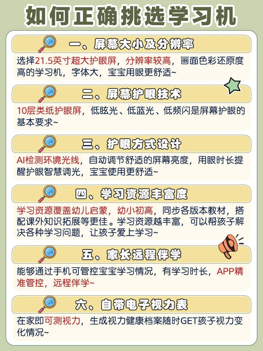 1️⃣护眼能力:孩子的视力是很重要的,护眼是关键,是基础~一定要注意看屏幕尺寸、材质以及护眼认证这些~